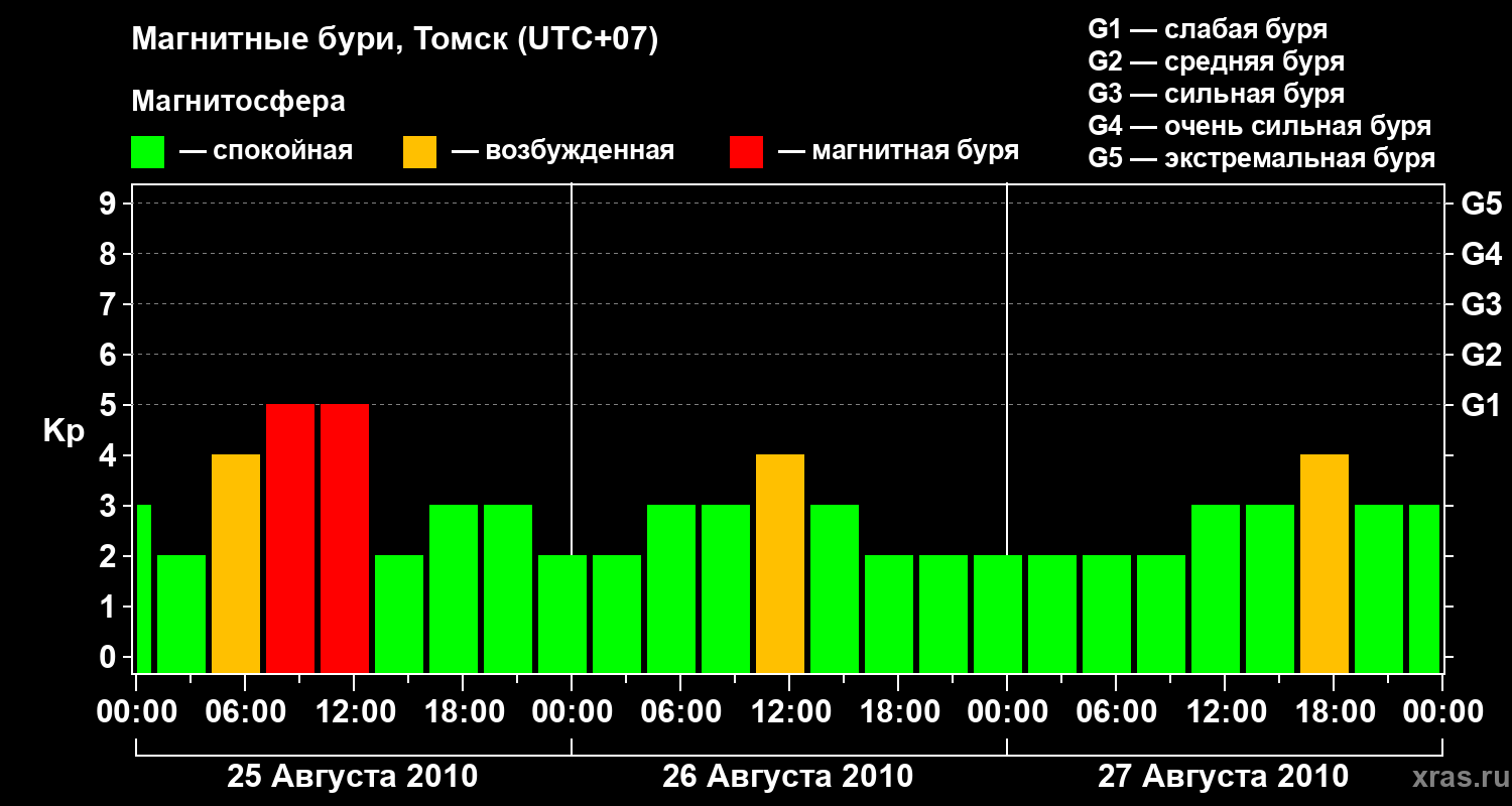 Изменения геомагнитного индекса Kp с 25 по 27 августа 2010 года для средних широт