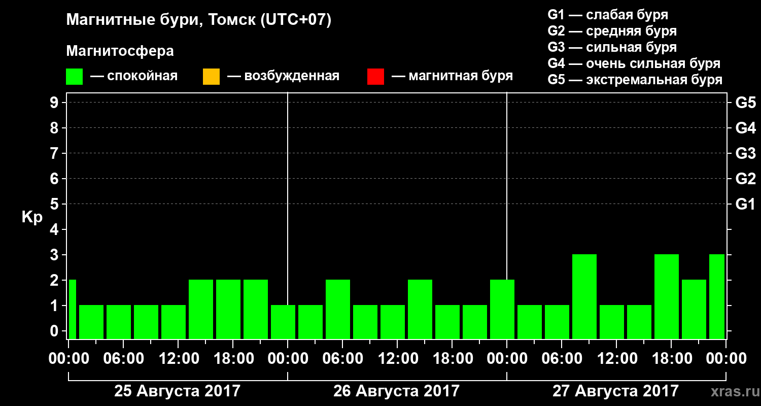 Изменения геомагнитного индекса Kp с 25 по 27 августа 2017 года для средних широт