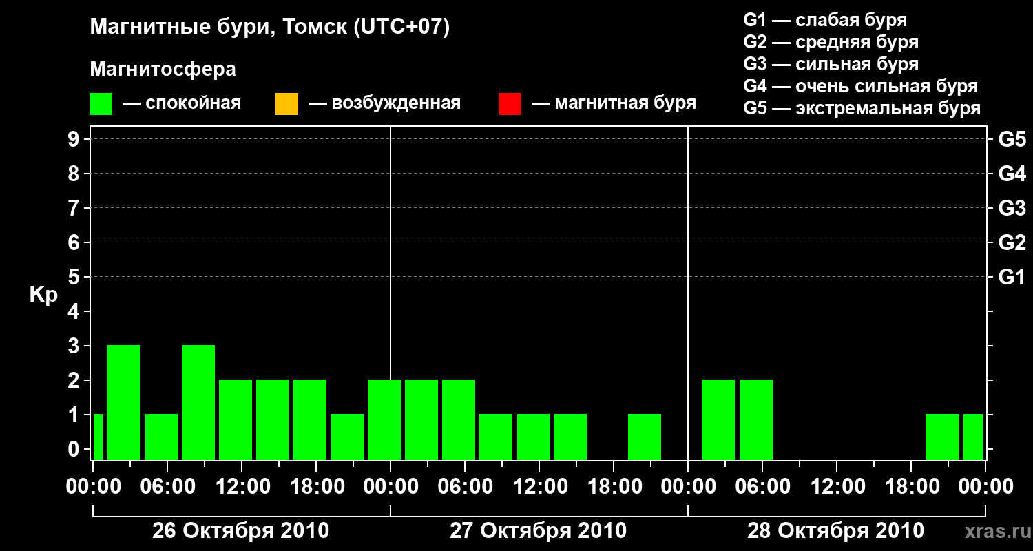 Изменения геомагнитного индекса Kp с 26 по 28 октября 2010 года для средних широт