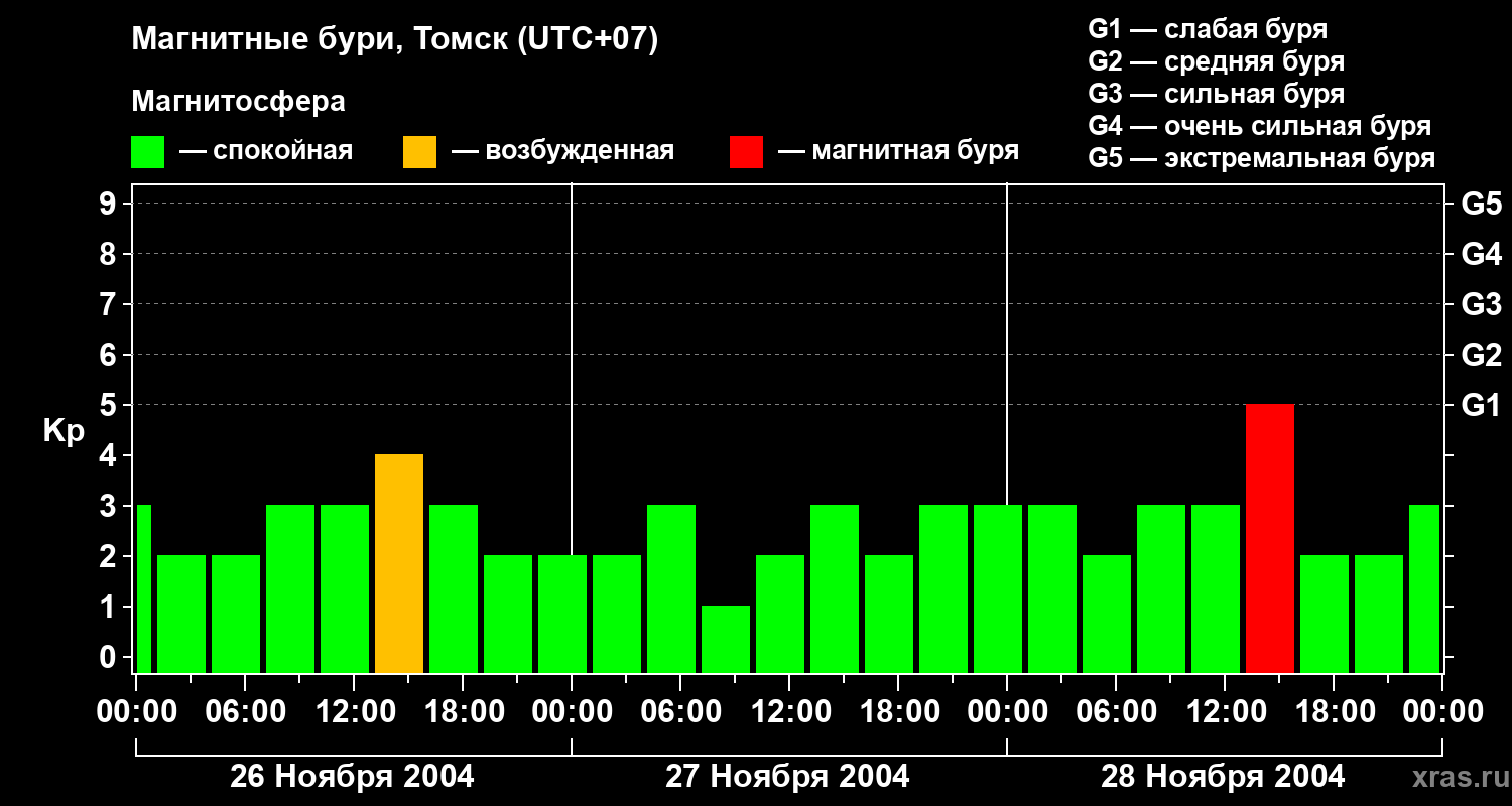 Изменения геомагнитного индекса Kp с 26 по 28 ноября 2004 года для средних широт