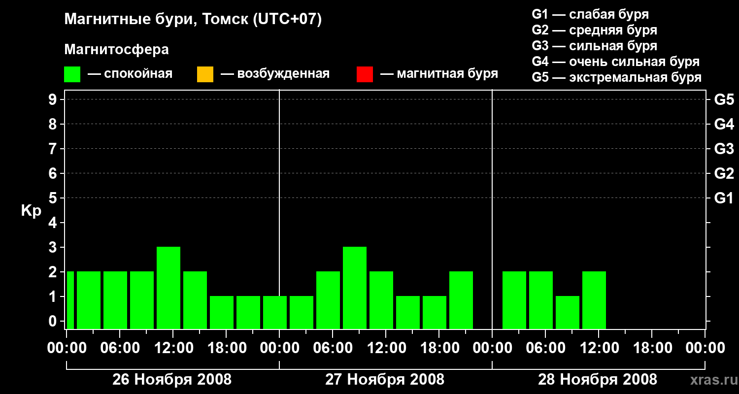 Изменения геомагнитного индекса Kp с 26 по 28 ноября 2008 года для средних широт