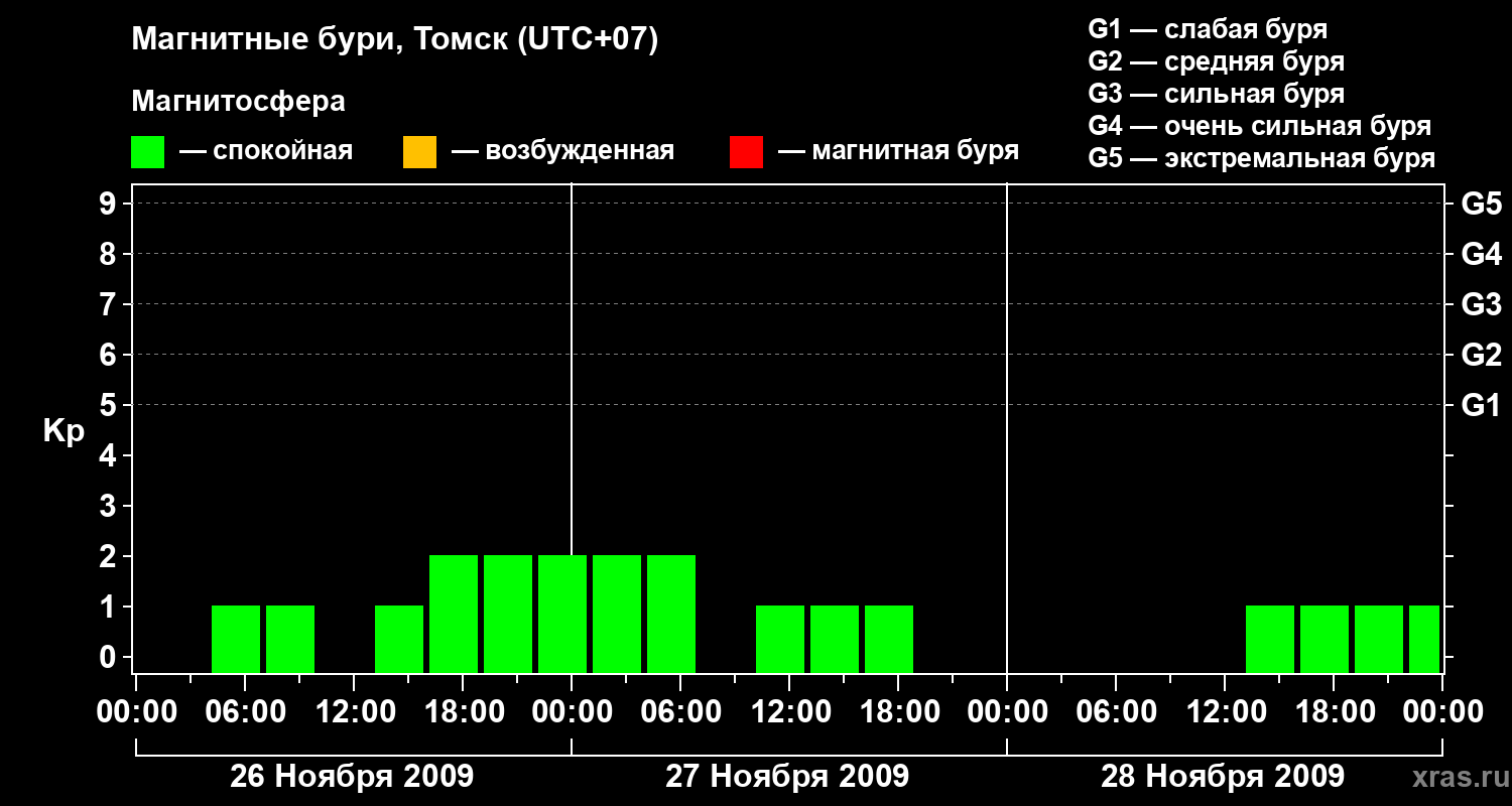 Изменения геомагнитного индекса Kp с 26 по 28 ноября 2009 года для средних широт