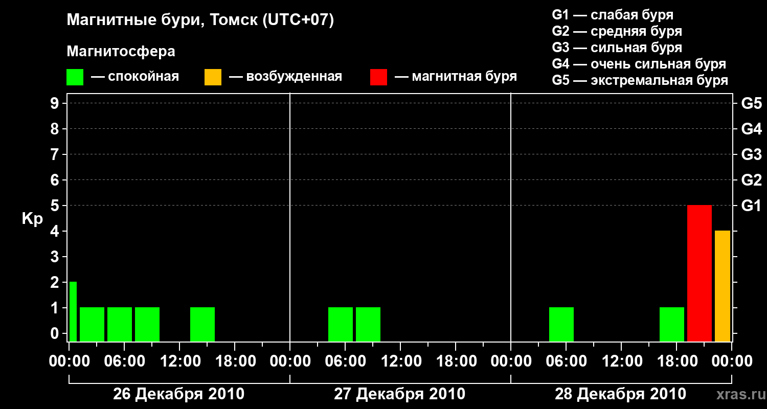 Изменения геомагнитного индекса Kp с 26 по 28 декабря 2010 года для средних широт
