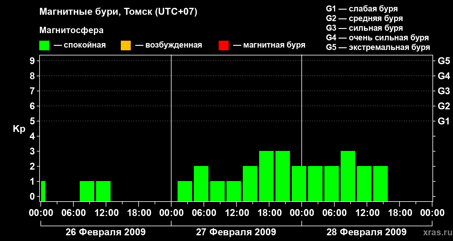 Изменения геомагнитного индекса Kp с 26 по 28 февраля 2009 года для средних широт
