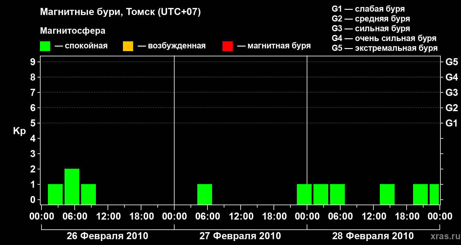 Изменения геомагнитного индекса Kp с 26 по 28 февраля 2010 года для средних широт
