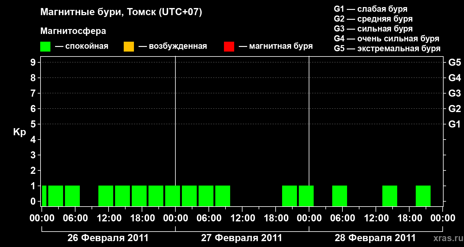 Изменения геомагнитного индекса Kp с 26 по 28 февраля 2011 года для средних широт