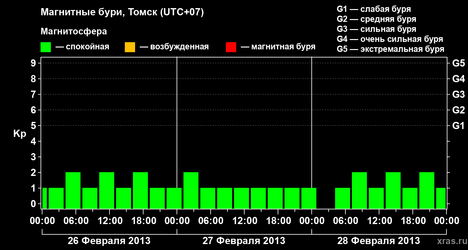 Изменения геомагнитного индекса Kp с 26 по 28 февраля 2013 года для средних широт
