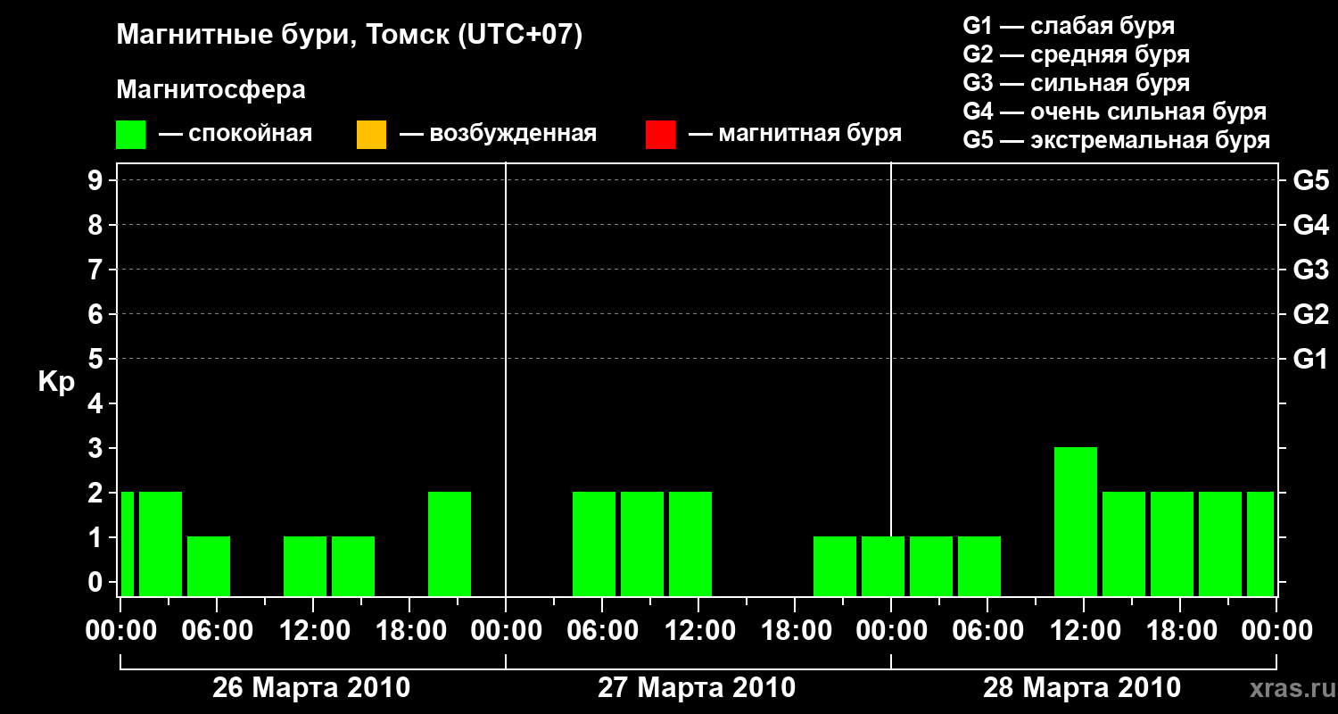 Изменения геомагнитного индекса Kp с 26 по 28 марта 2010 года для средних широт
