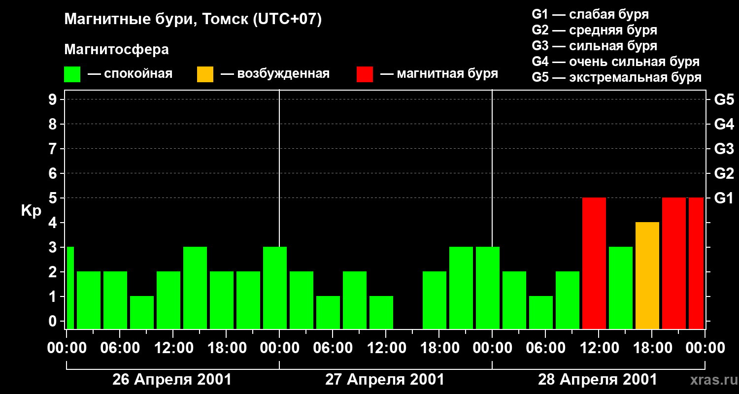 Изменения геомагнитного индекса Kp с 26 по 28 апреля 2001 года для средних широт