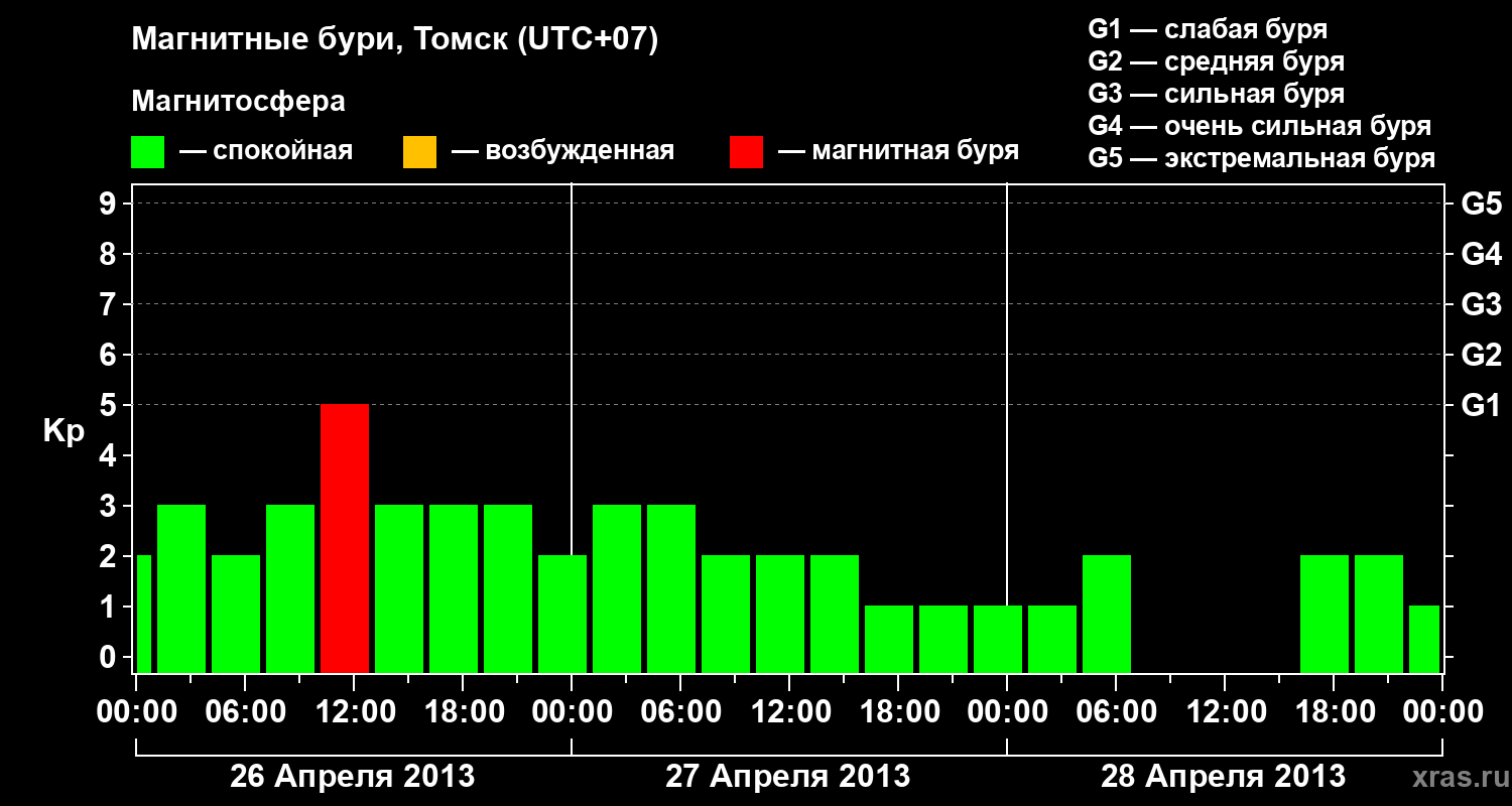 Изменения геомагнитного индекса Kp с 26 по 28 апреля 2013 года для средних широт