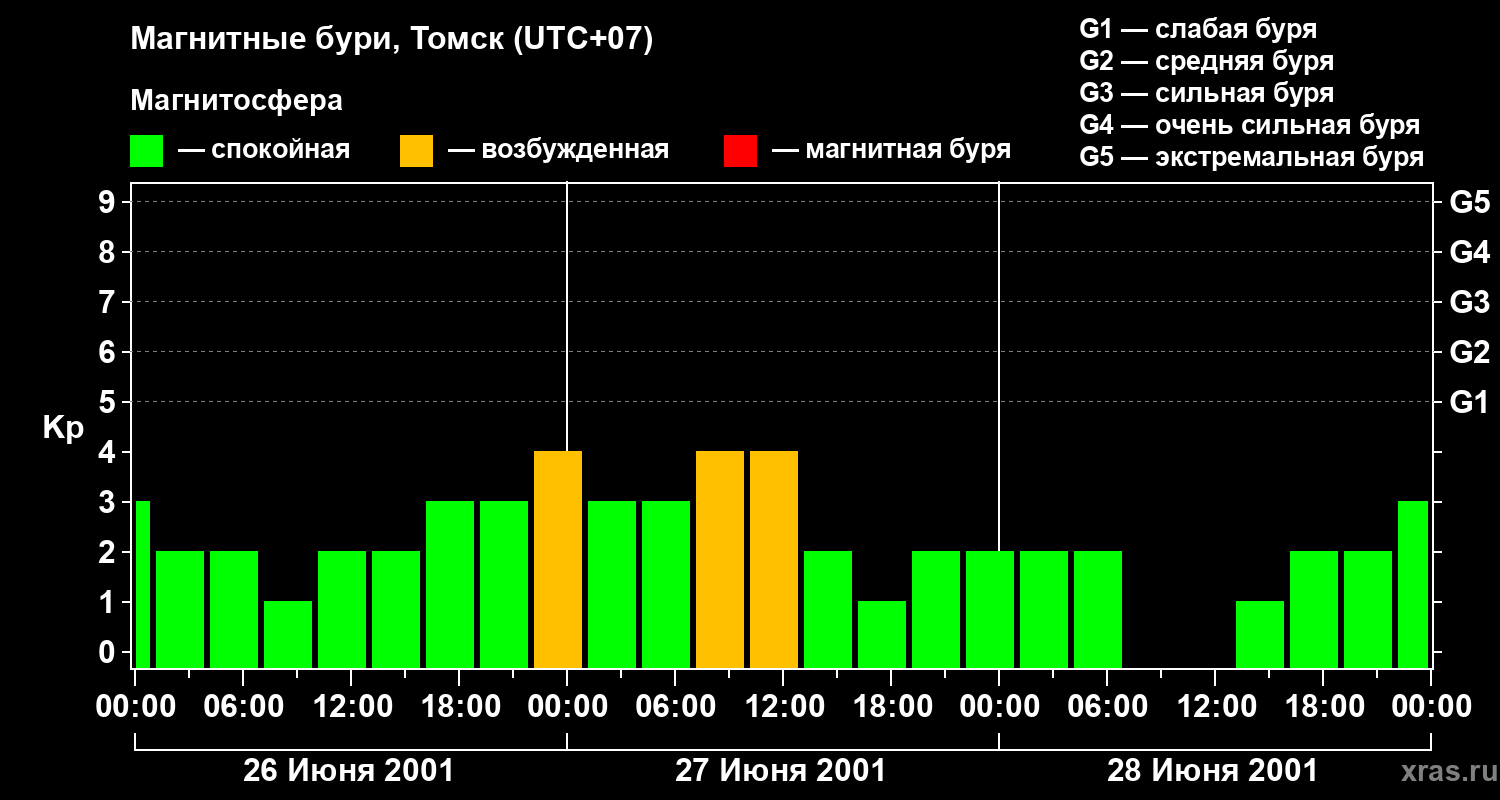 Изменения геомагнитного индекса Kp с 26 по 28 июня 2001 года для средних широт
