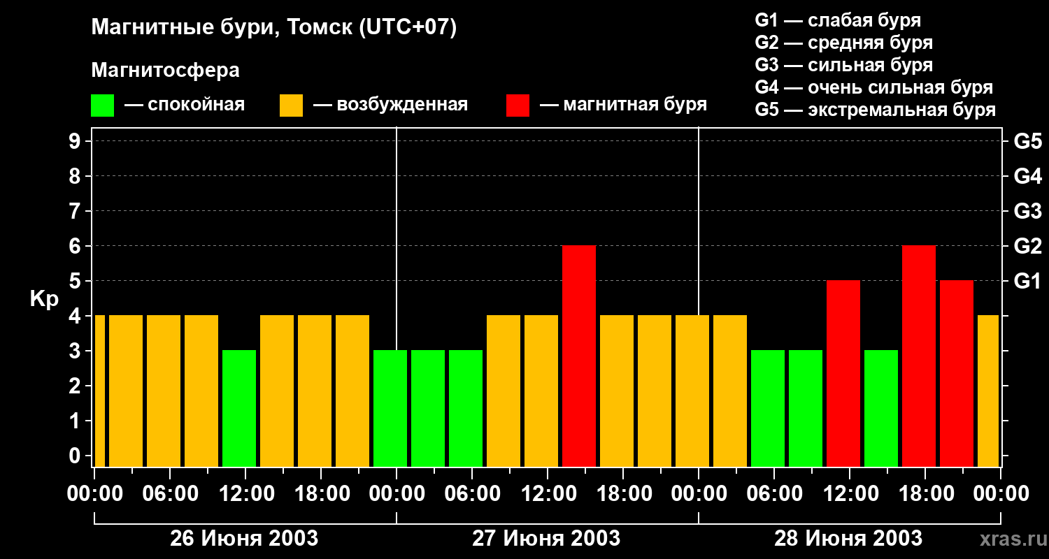 Изменения геомагнитного индекса Kp с 26 по 28 июня 2003 года для средних широт