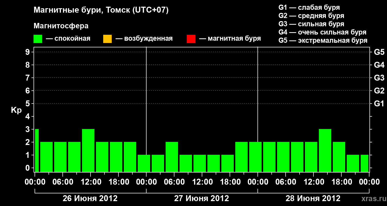 Изменения геомагнитного индекса Kp с 26 по 28 июня 2012 года для средних широт