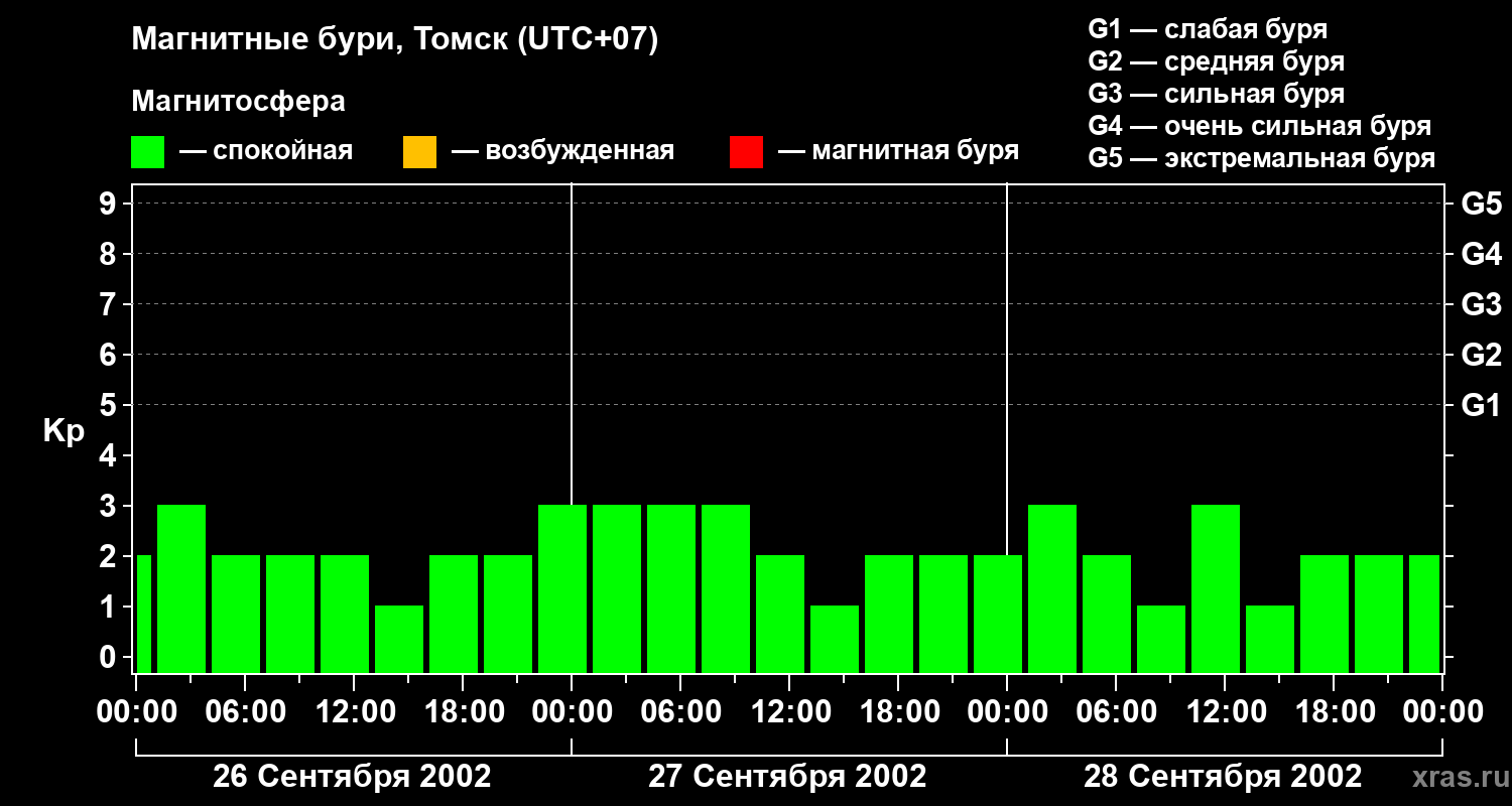 Изменения геомагнитного индекса Kp с 26 по 28 сентября 2002 года для средних широт