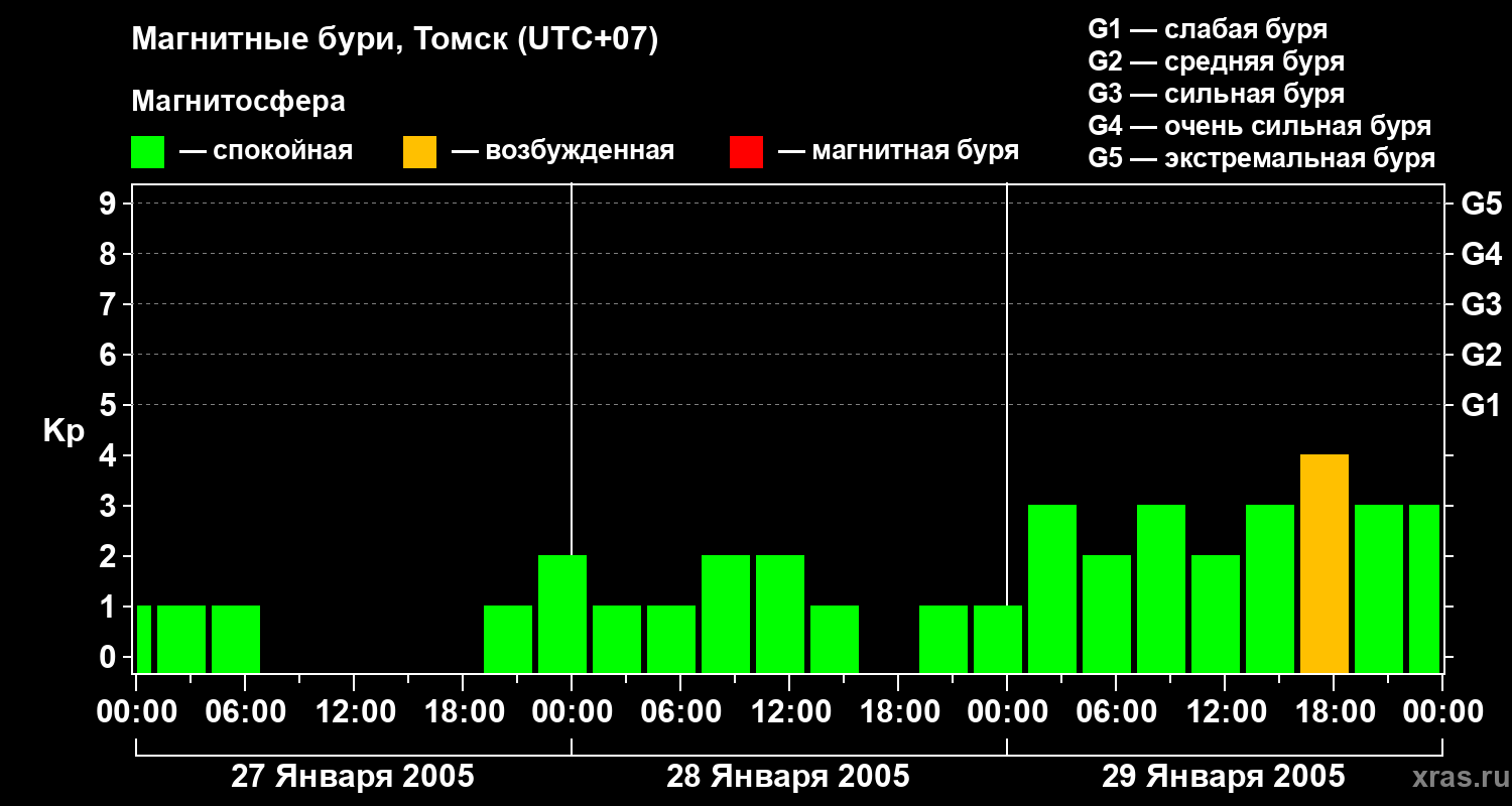 Изменения геомагнитного индекса Kp с 27 по 29 января 2005 года для средних широт