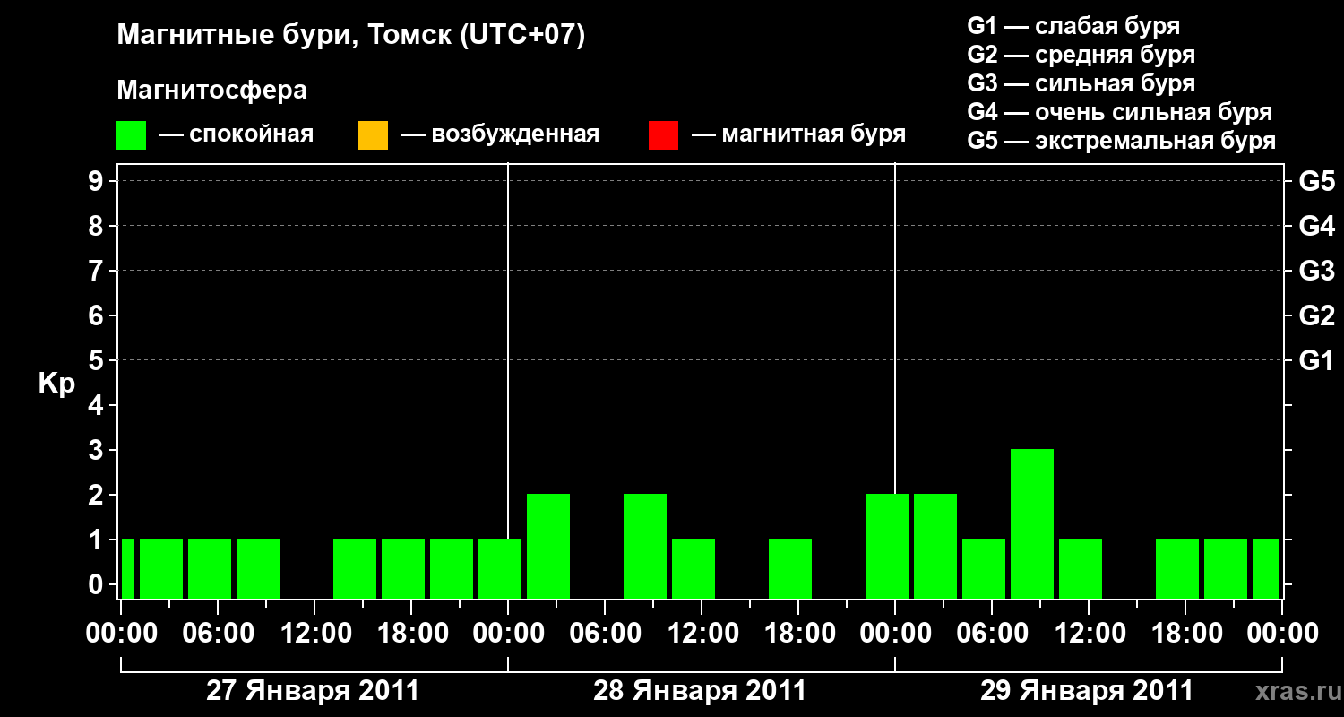 Изменения геомагнитного индекса Kp с 27 по 29 января 2011 года для средних широт