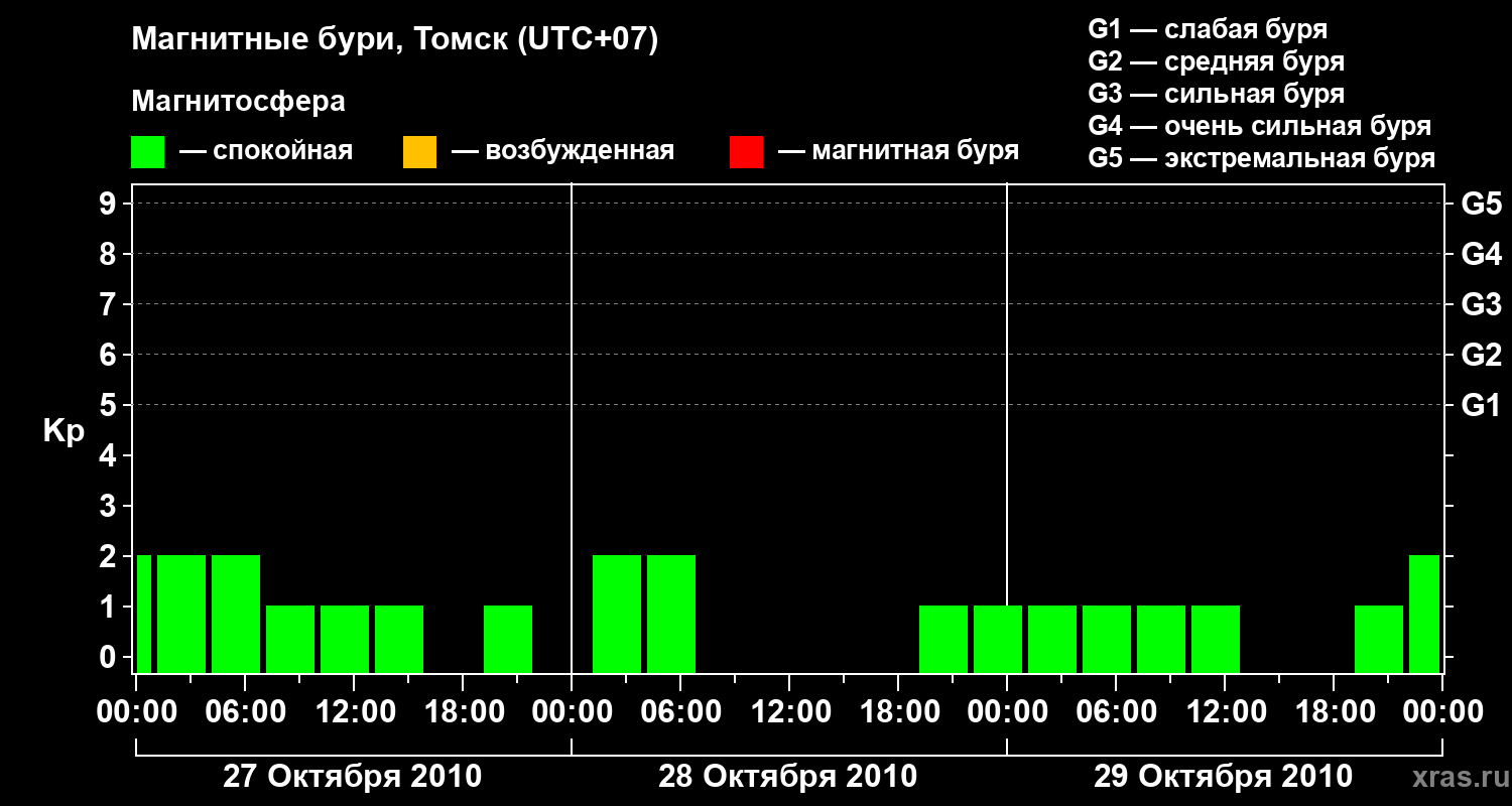 Изменения геомагнитного индекса Kp с 27 по 29 октября 2010 года для средних широт