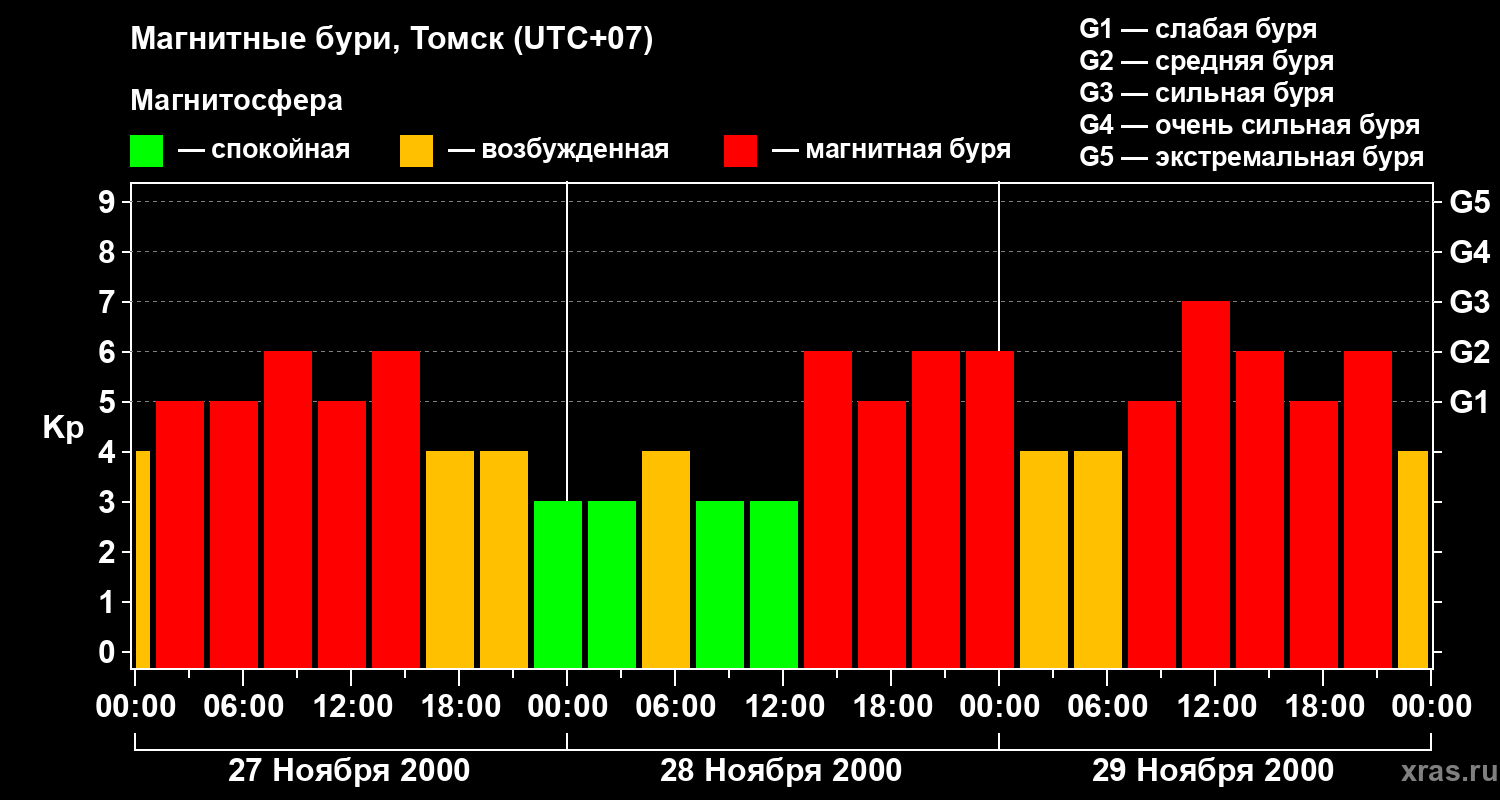 Изменения геомагнитного индекса Kp с 27 по 29 ноября 2000 года для средних широт
