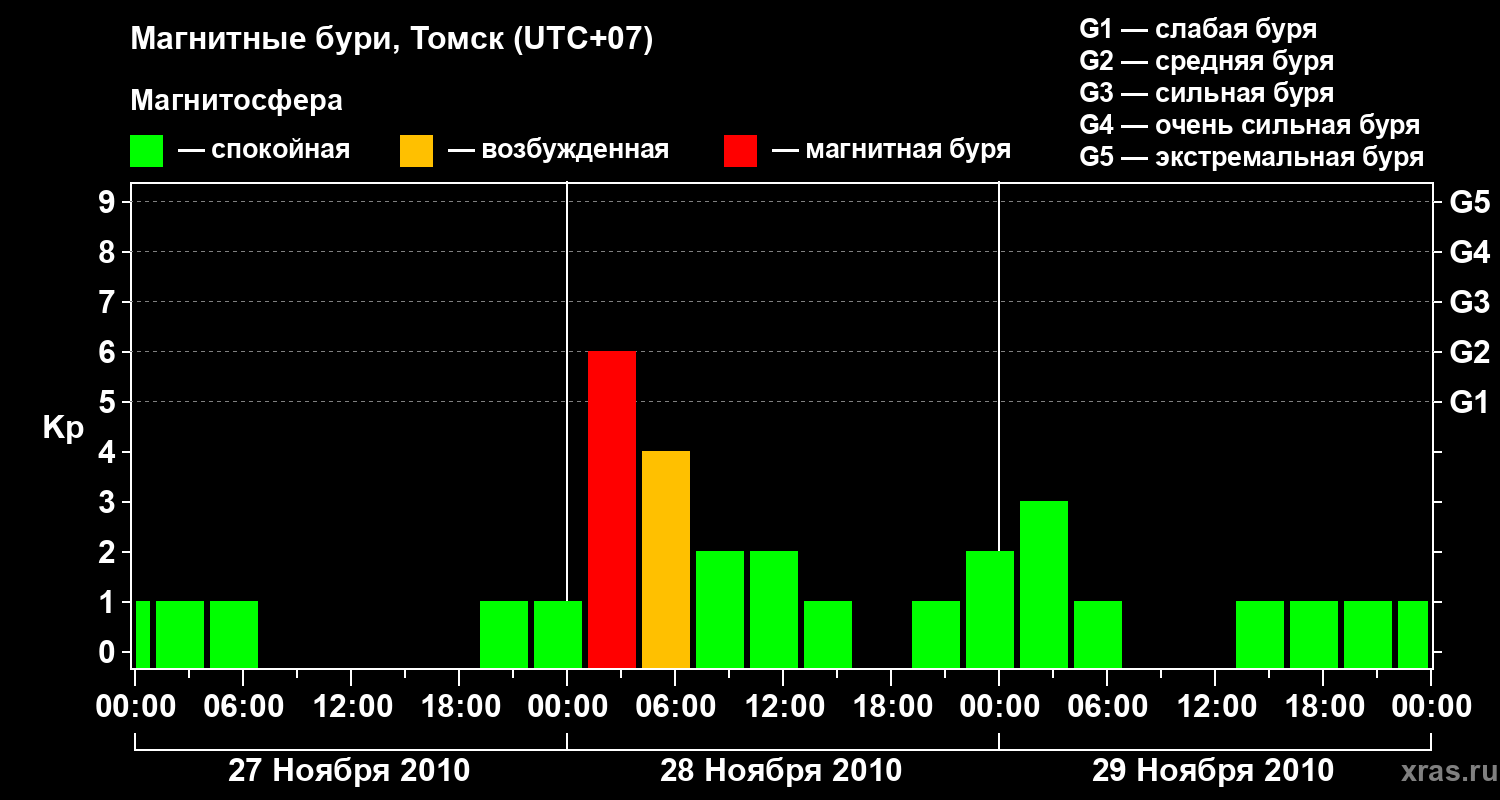 Изменения геомагнитного индекса Kp с 27 по 29 ноября 2010 года для средних широт