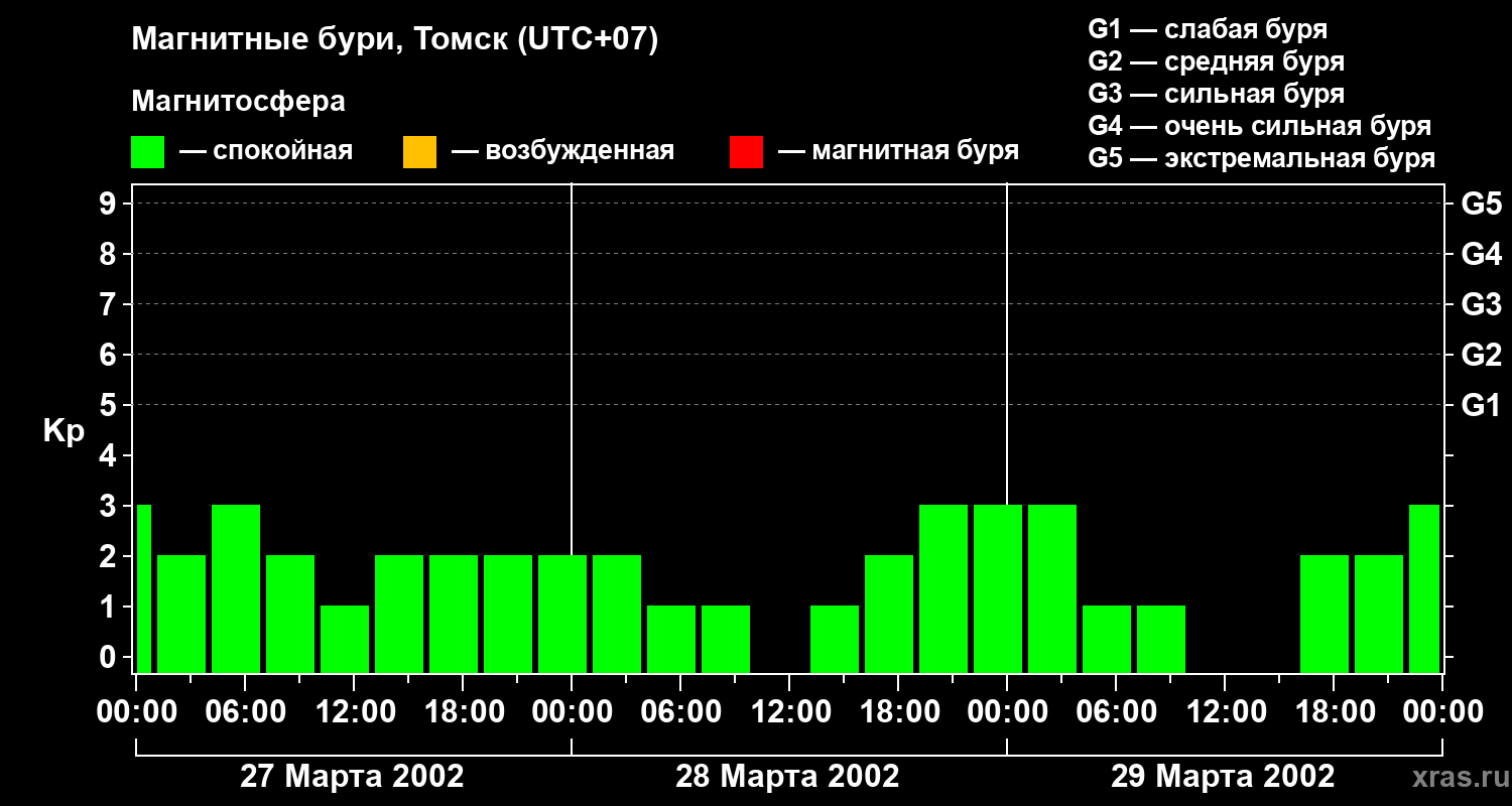 Изменения геомагнитного индекса Kp с 27 по 29 марта 2002 года для средних широт