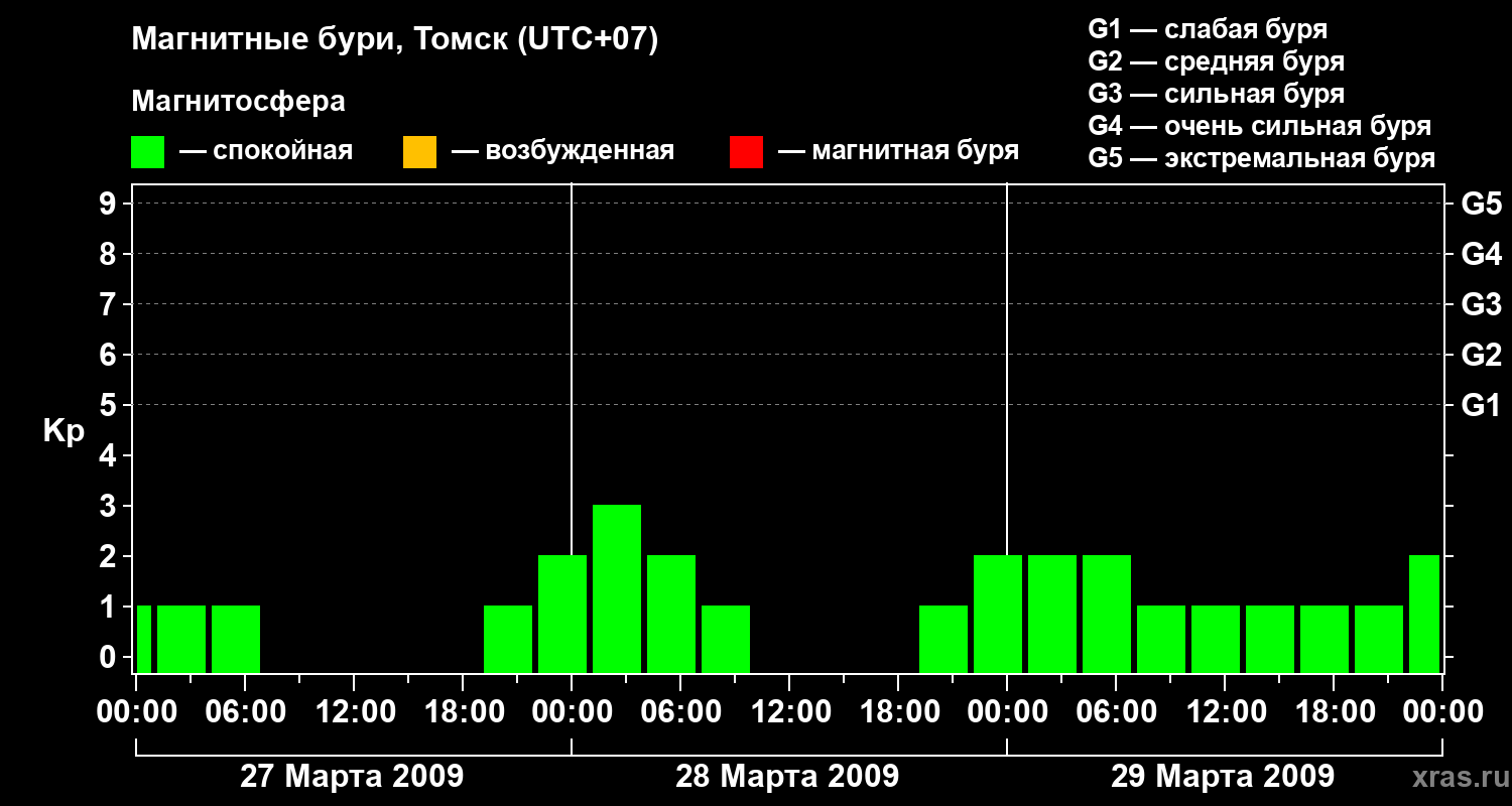 Изменения геомагнитного индекса Kp с 27 по 29 марта 2009 года для средних широт