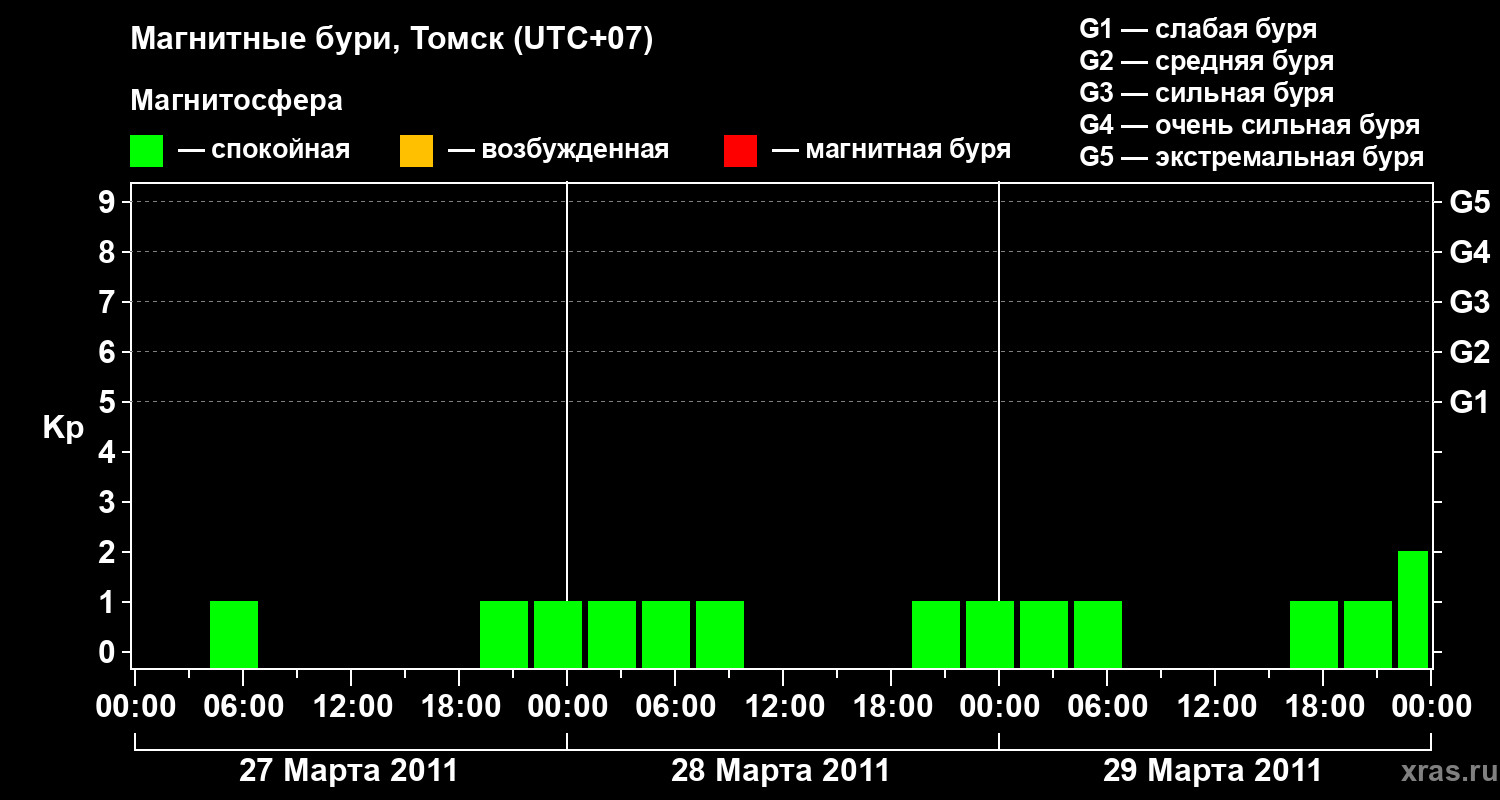 Изменения геомагнитного индекса Kp с 27 по 29 марта 2011 года для средних широт