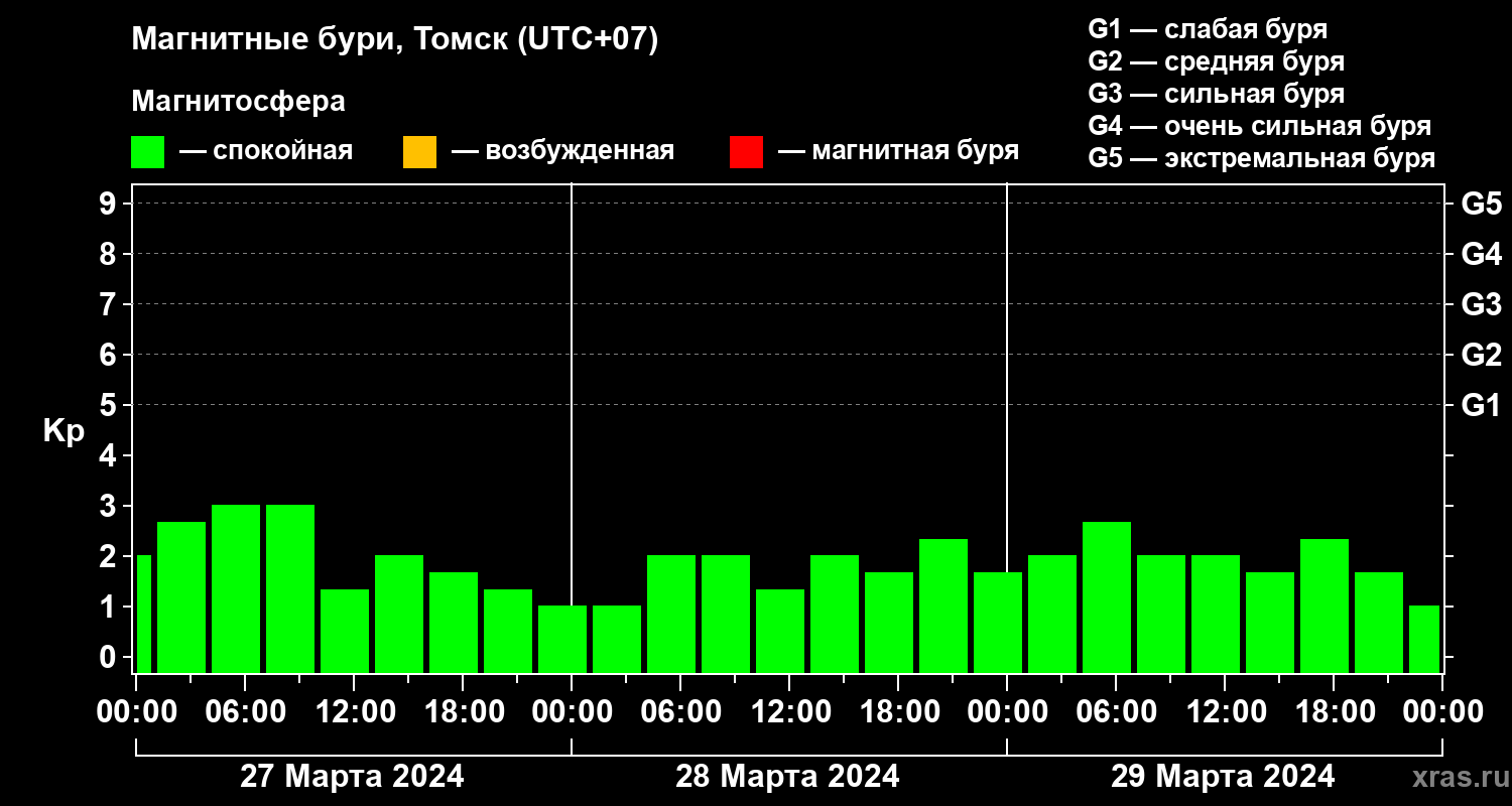 Изменения геомагнитного индекса Kp с 27 по 29 марта 2024 года для средних широт