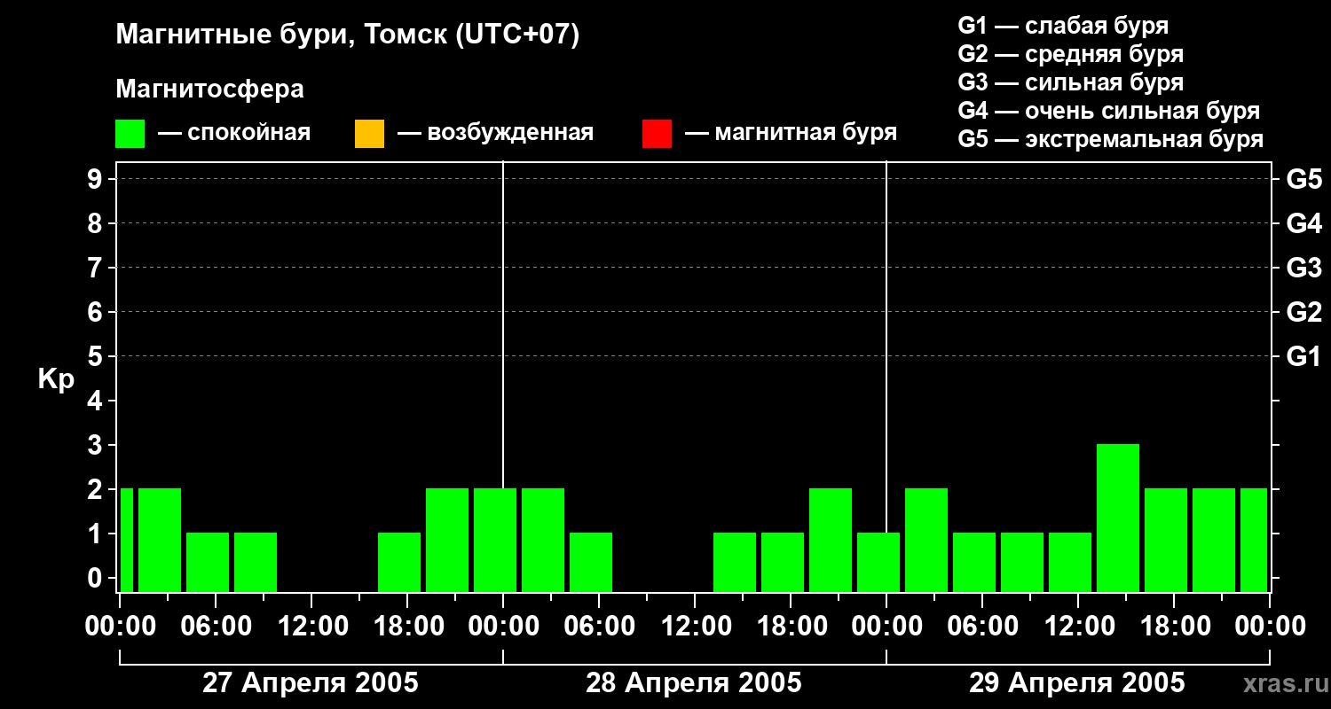 Изменения геомагнитного индекса Kp с 27 по 29 апреля 2005 года для средних широт