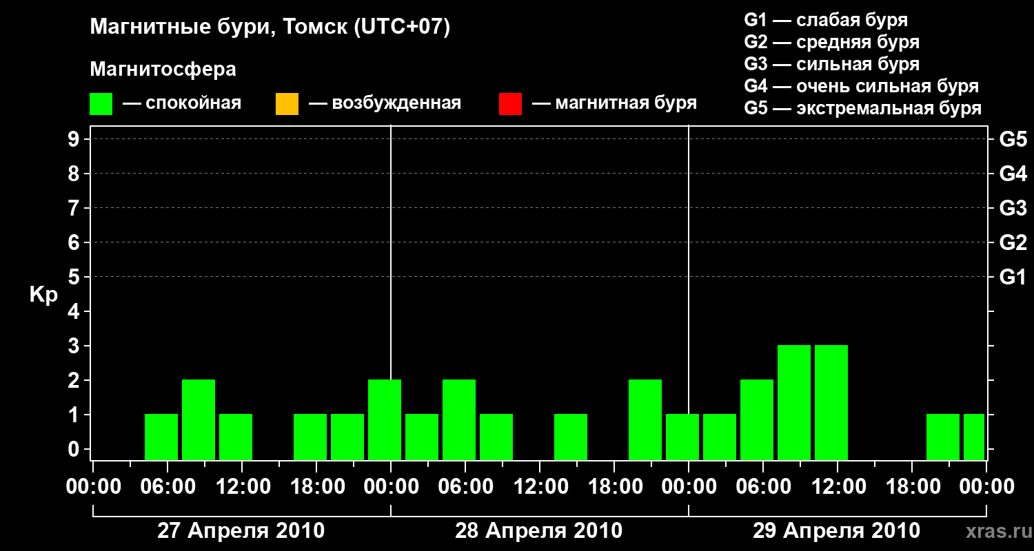 Изменения геомагнитного индекса Kp с 27 по 29 апреля 2010 года для средних широт