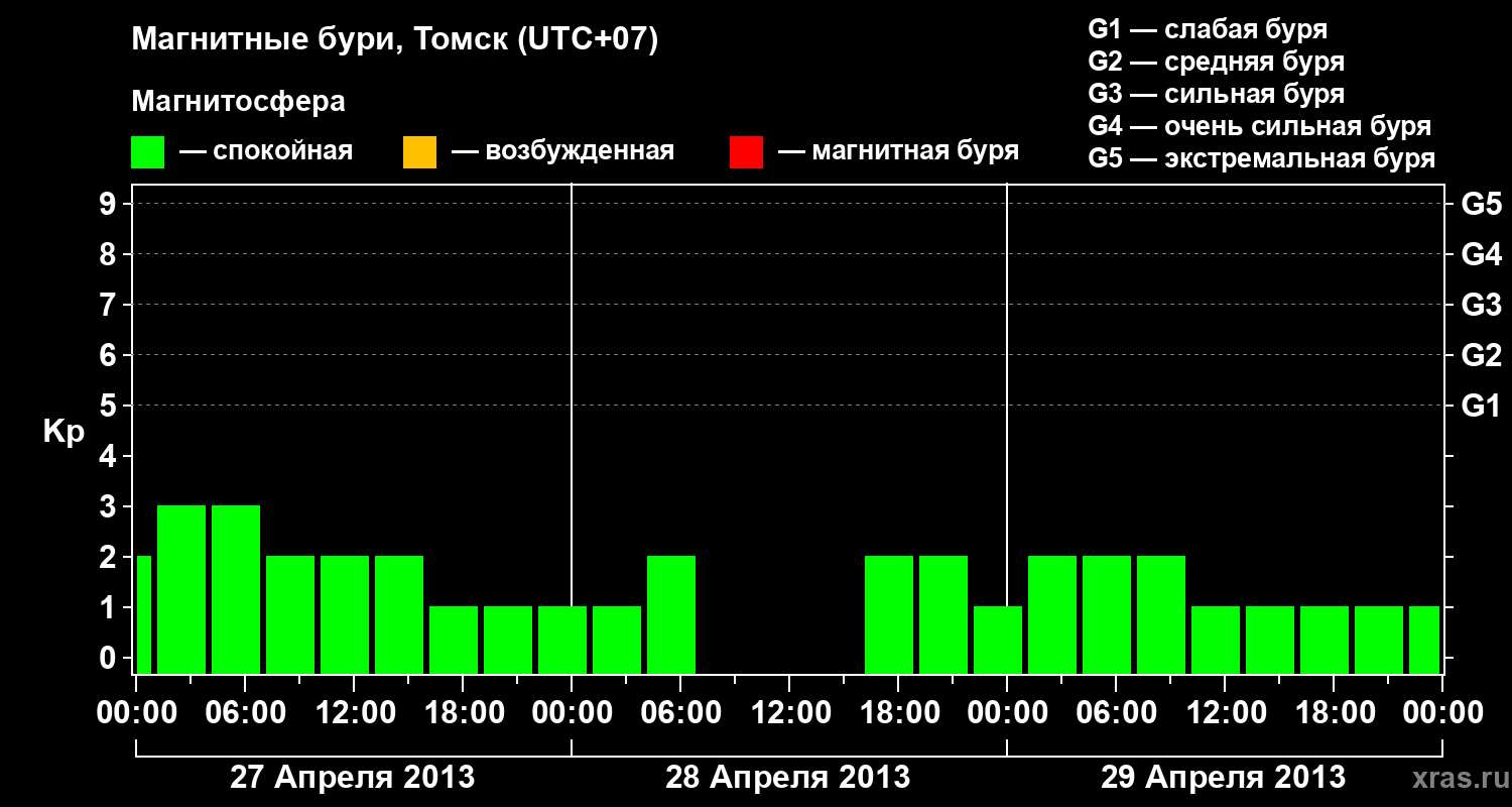 Изменения геомагнитного индекса Kp с 27 по 29 апреля 2013 года для средних широт