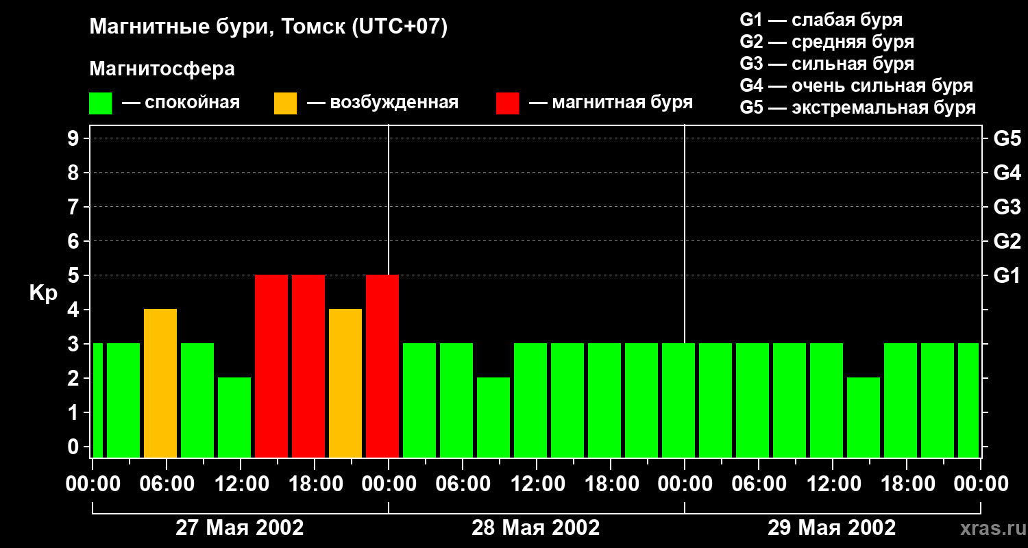 Изменения геомагнитного индекса Kp с 27 по 29 мая 2002 года для средних широт