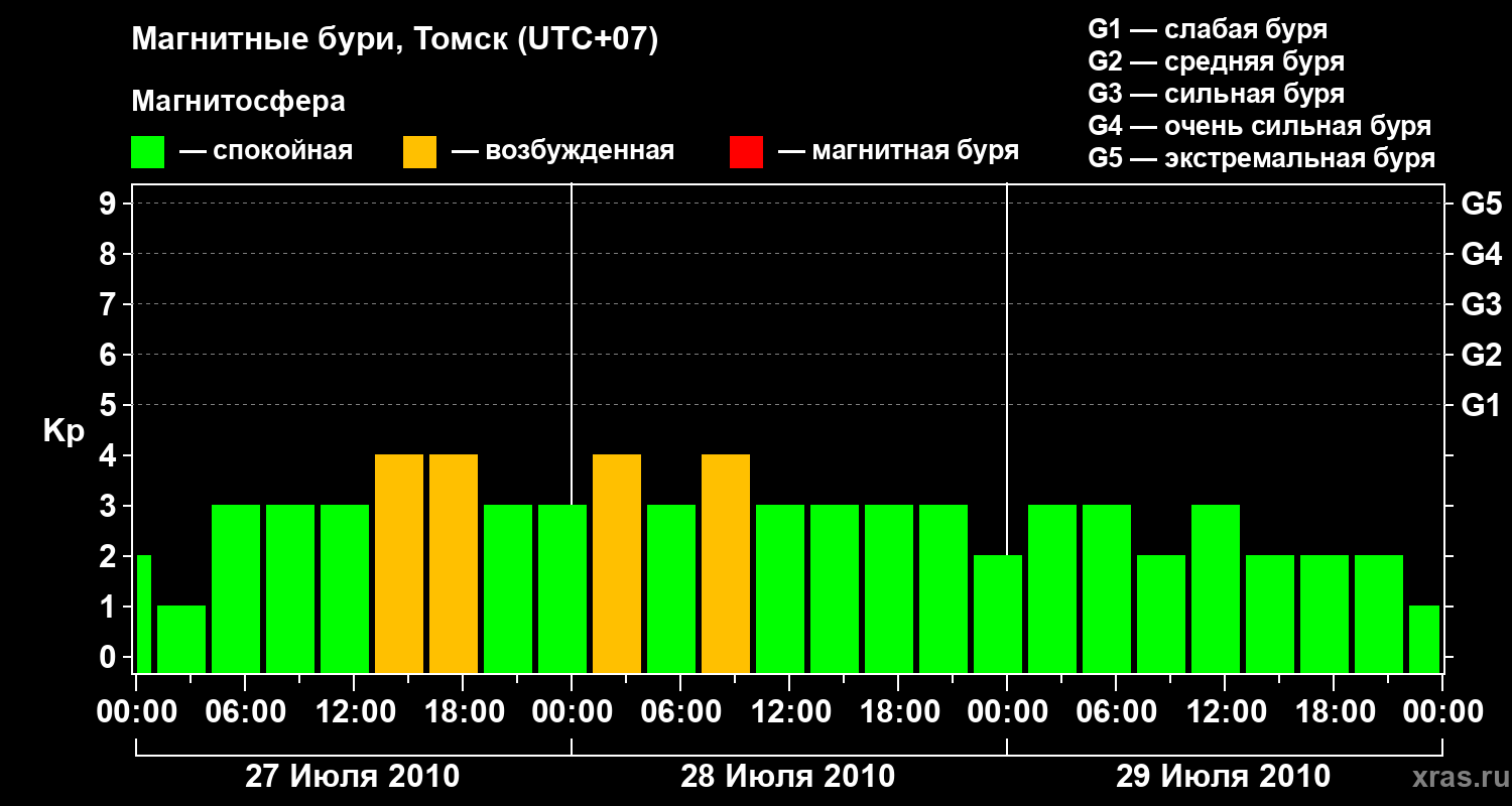 Изменения геомагнитного индекса Kp с 27 по 29 июля 2010 года для средних широт