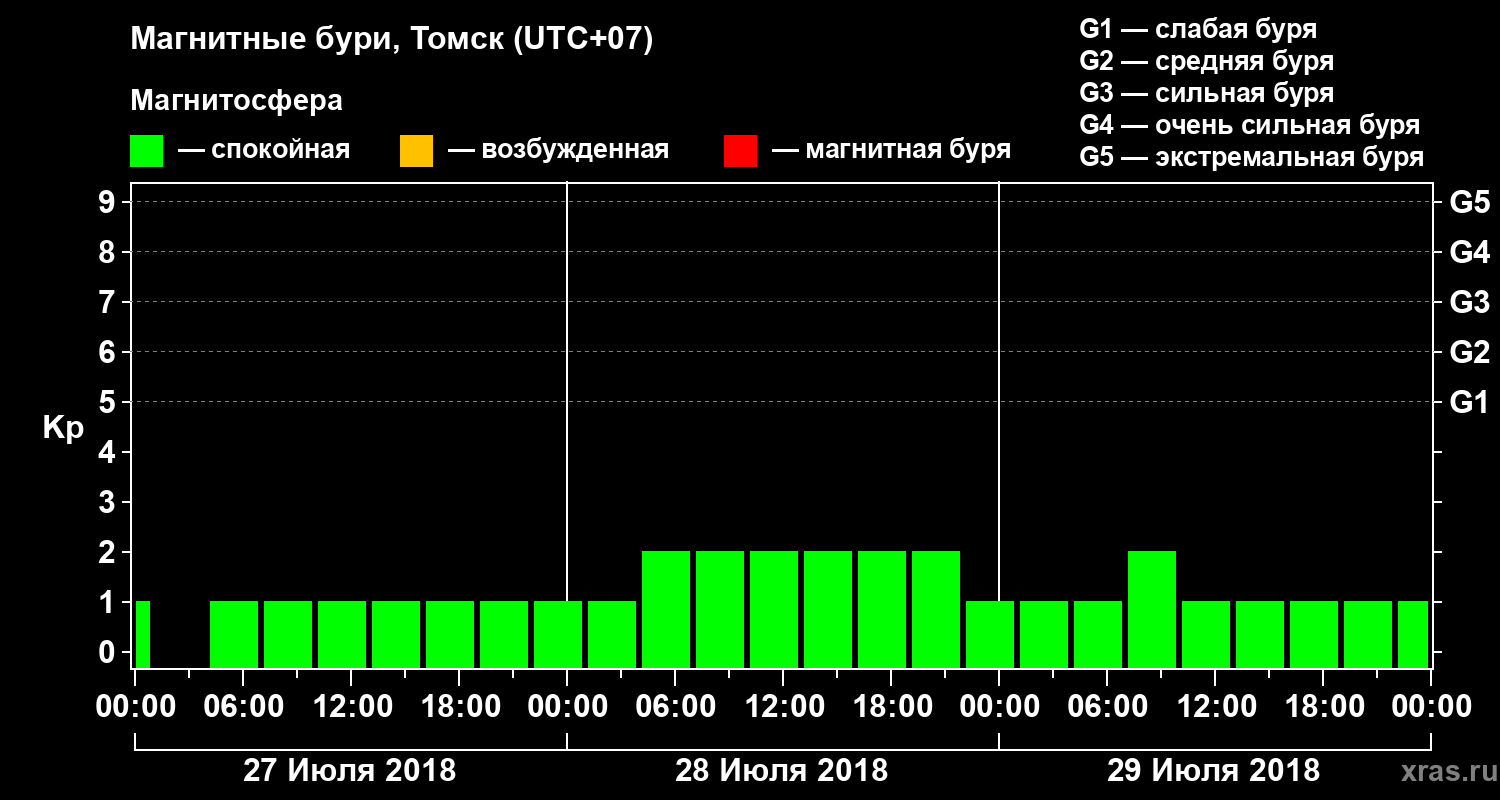Изменения геомагнитного индекса Kp с 27 по 29 июля 2018 года для средних широт