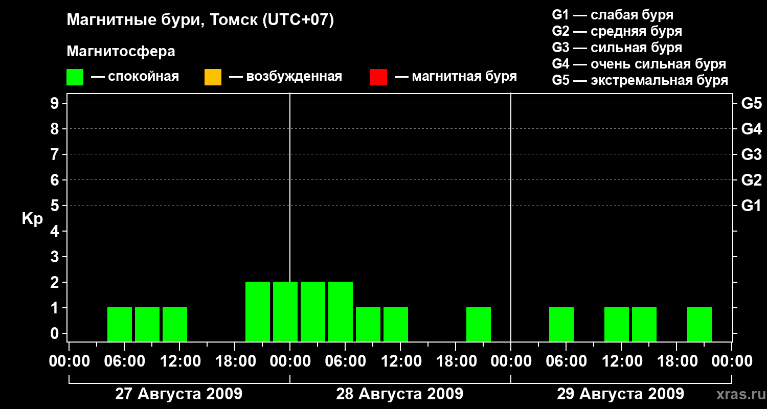 Изменения геомагнитного индекса Kp с 27 по 29 августа 2009 года для средних широт