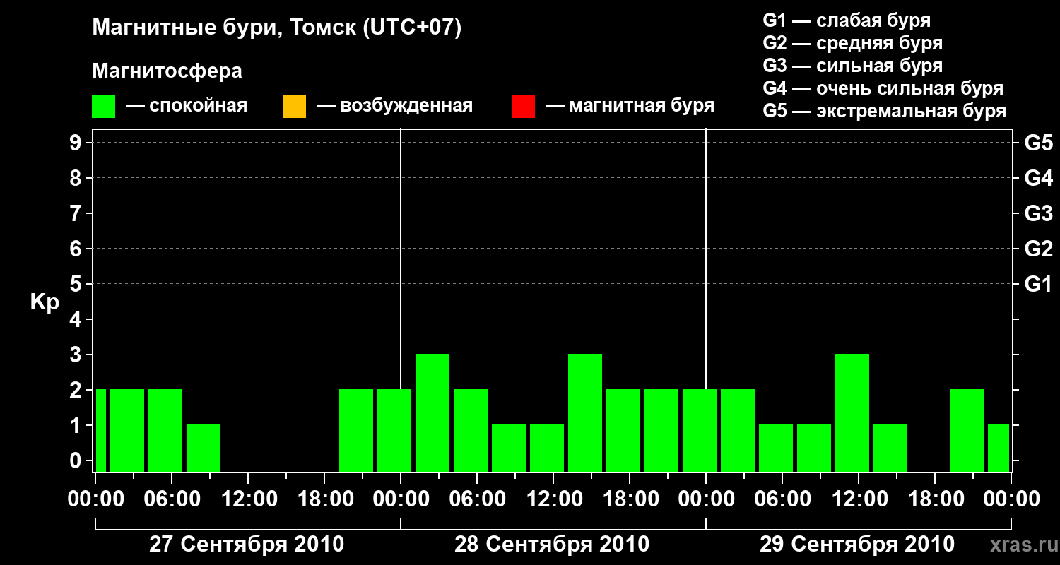 Изменения геомагнитного индекса Kp с 27 по 29 сентября 2010 года для средних широт