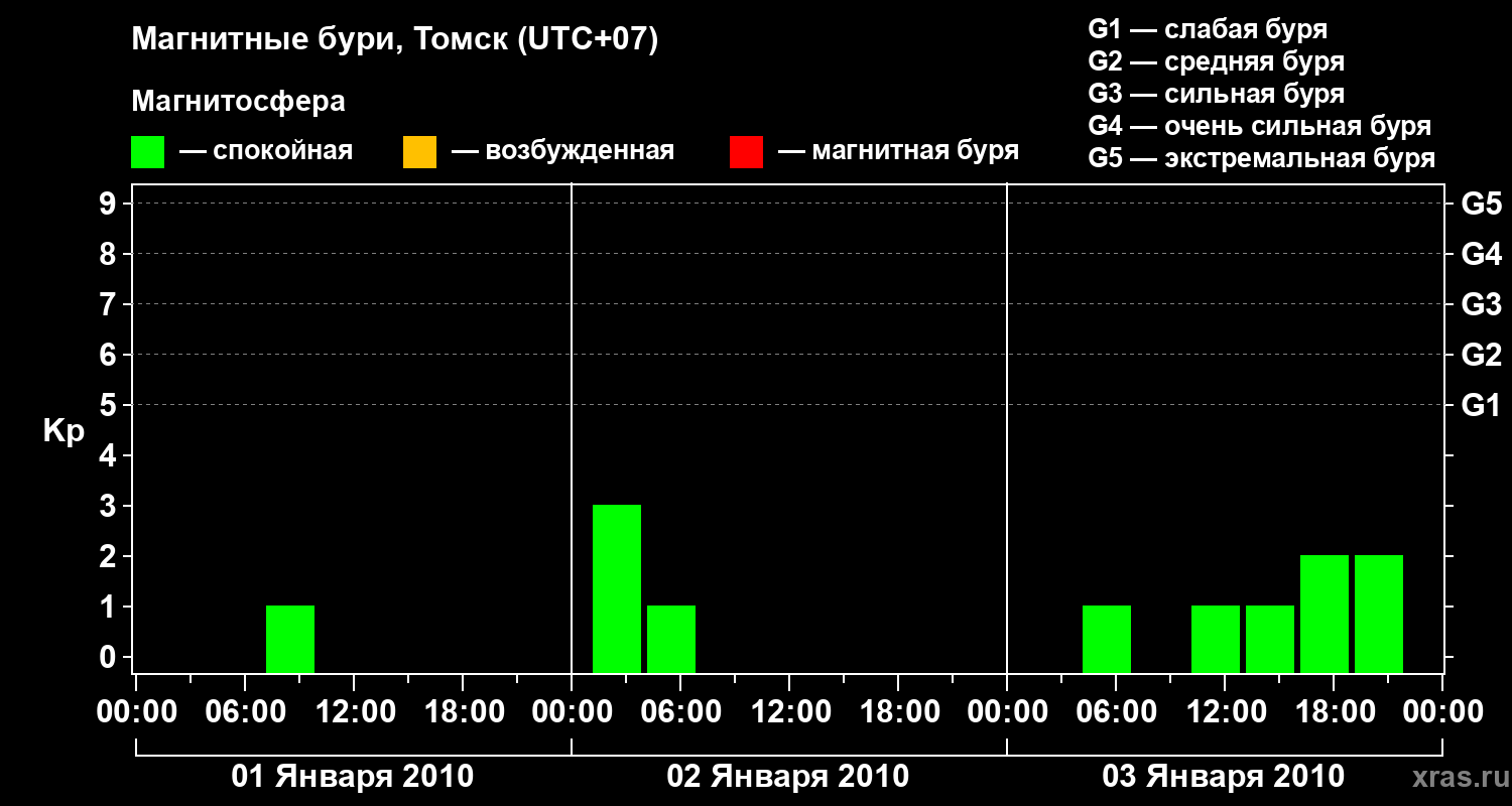 Изменения геомагнитного индекса Kp с 1 по 3 января 2010 года для средних широт