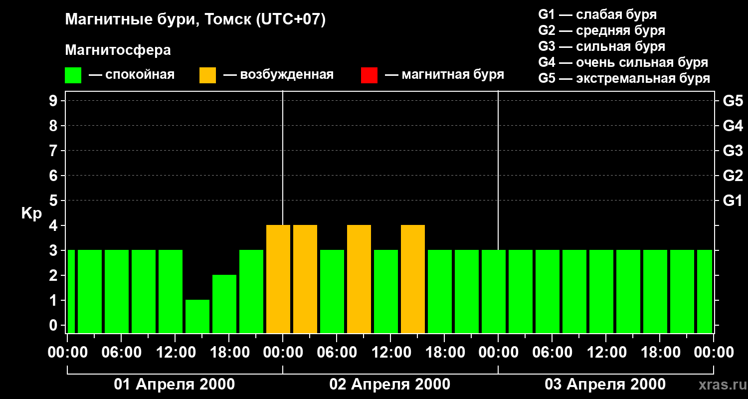 Изменения геомагнитного индекса Kp с 1 по 3 апреля 2000 года для средних широт