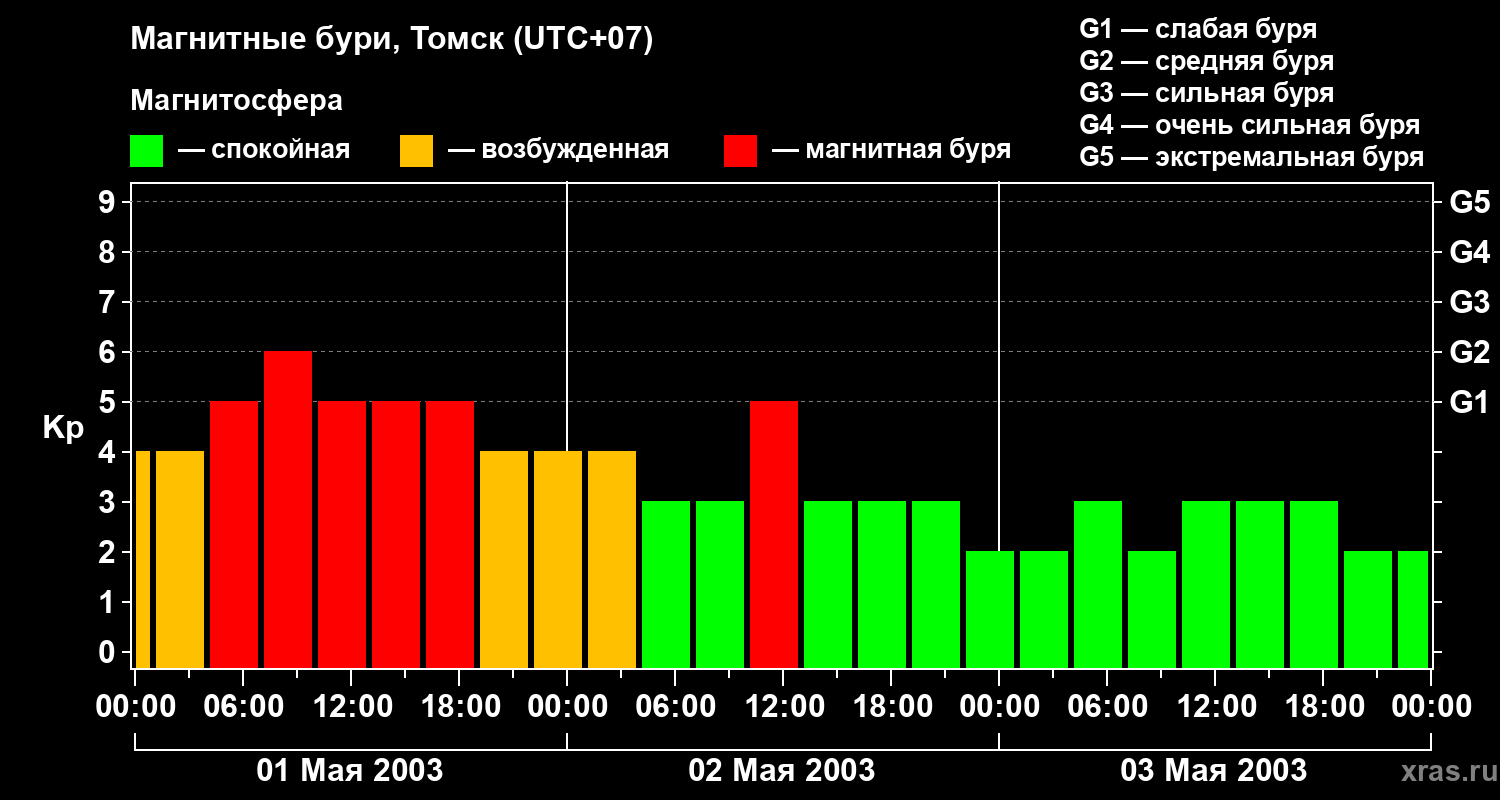 Изменения геомагнитного индекса Kp с 1 по 3 мая 2003 года для средних широт