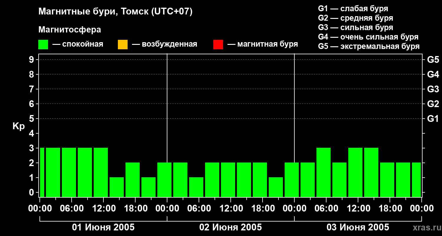 Изменения геомагнитного индекса Kp с 1 по 3 июня 2005 года для средних широт