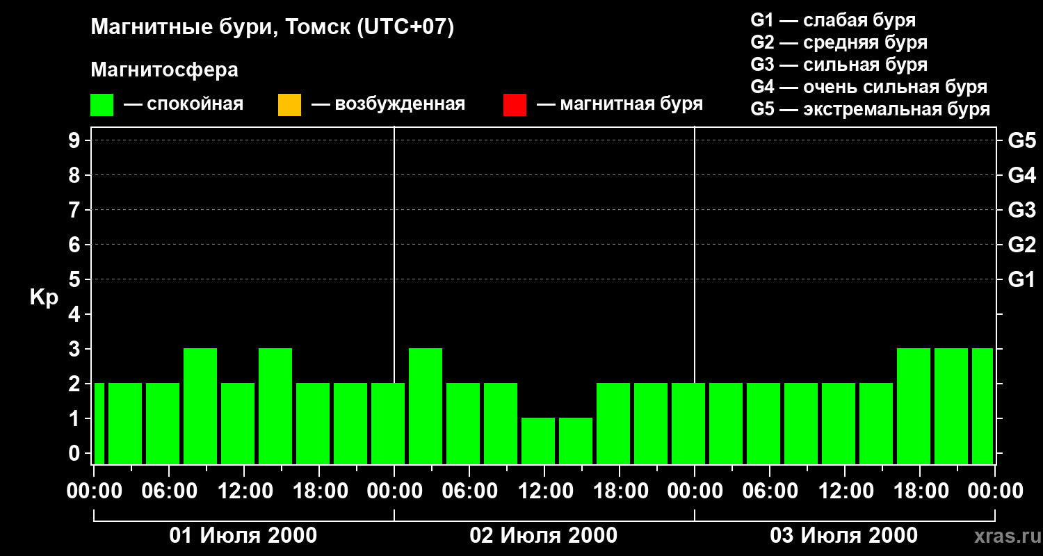 Изменения геомагнитного индекса Kp с 1 по 3 июля 2000 года для средних широт
