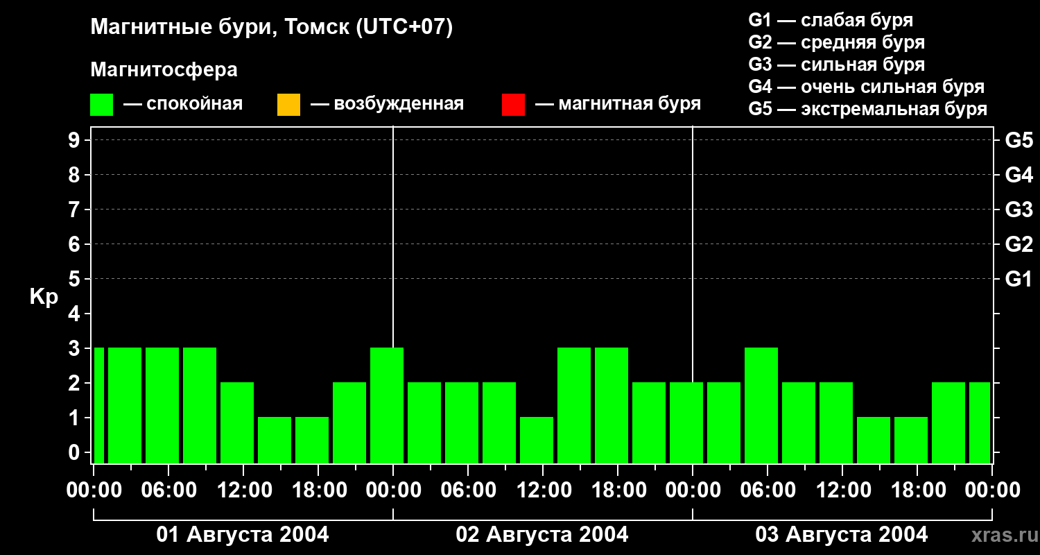 Изменения геомагнитного индекса Kp с 1 по 3 августа 2004 года для средних широт