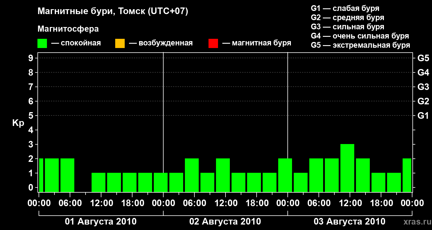 Изменения геомагнитного индекса Kp с 1 по 3 августа 2010 года для средних широт