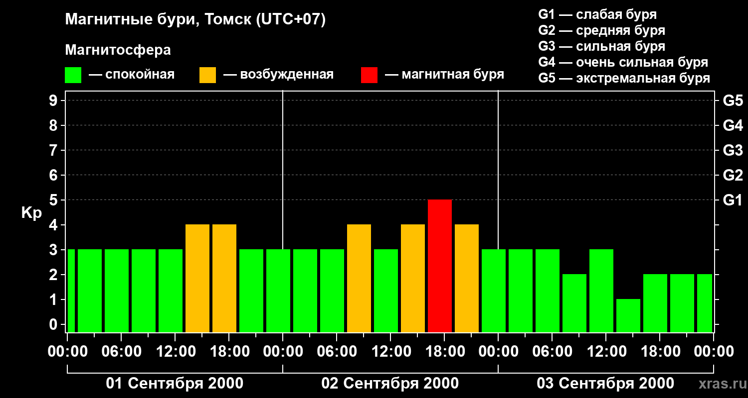 Изменения геомагнитного индекса Kp с 1 по 3 сентября 2000 года для средних широт