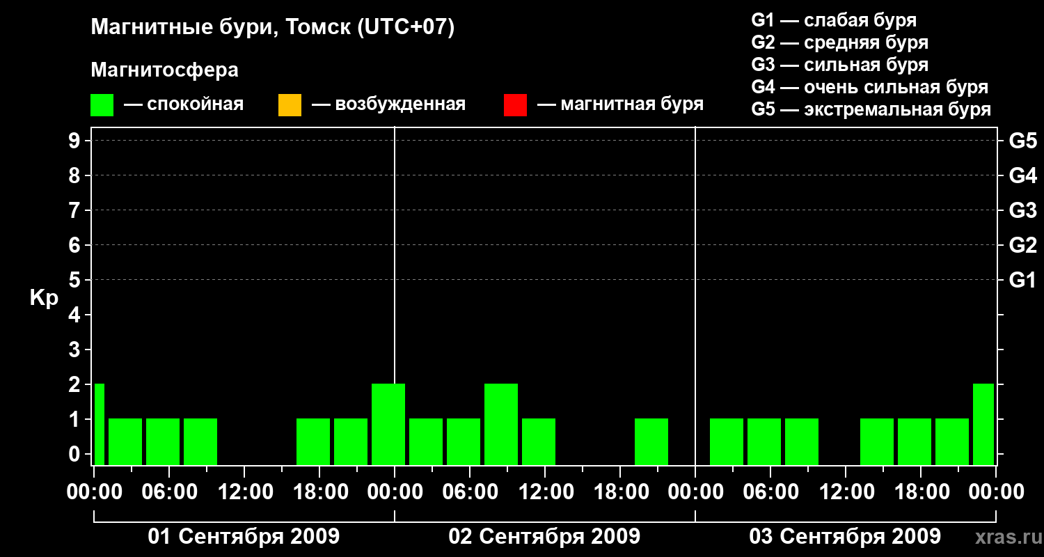 Изменения геомагнитного индекса Kp с 1 по 3 сентября 2009 года для средних широт