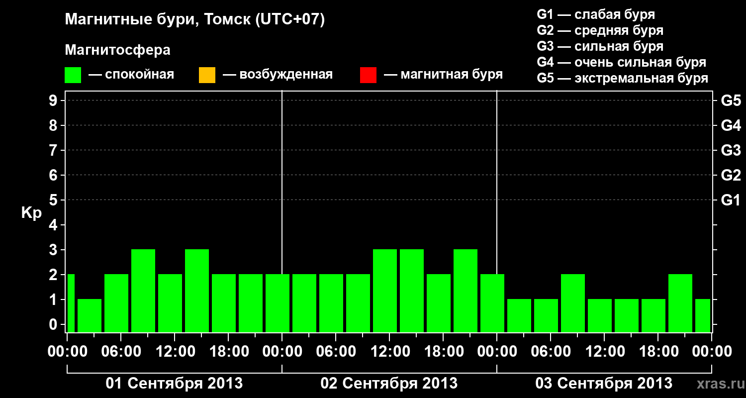 Изменения геомагнитного индекса Kp с 1 по 3 сентября 2013 года для средних широт