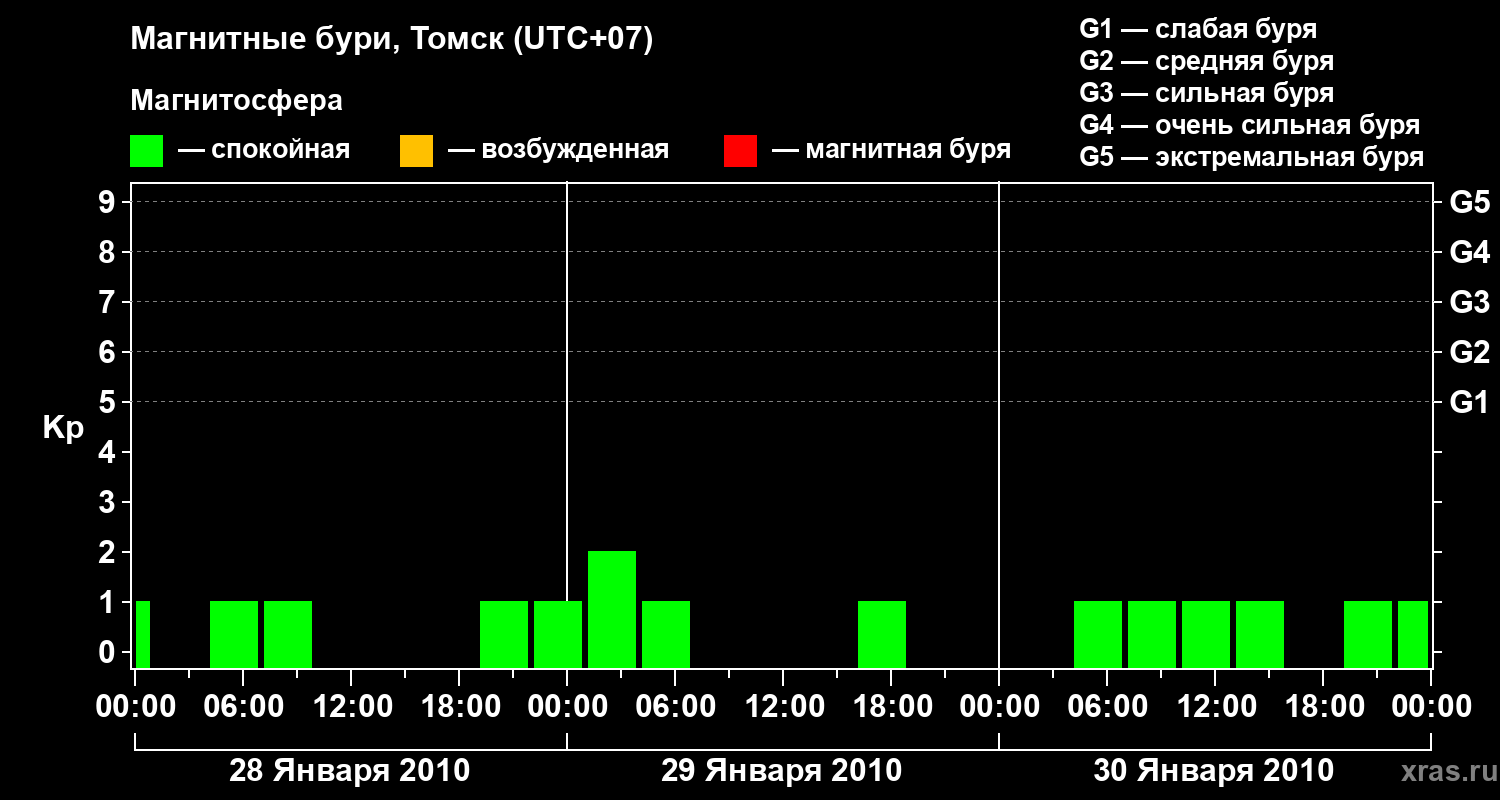 Изменения геомагнитного индекса Kp с 28 по 30 января 2010 года для средних широт