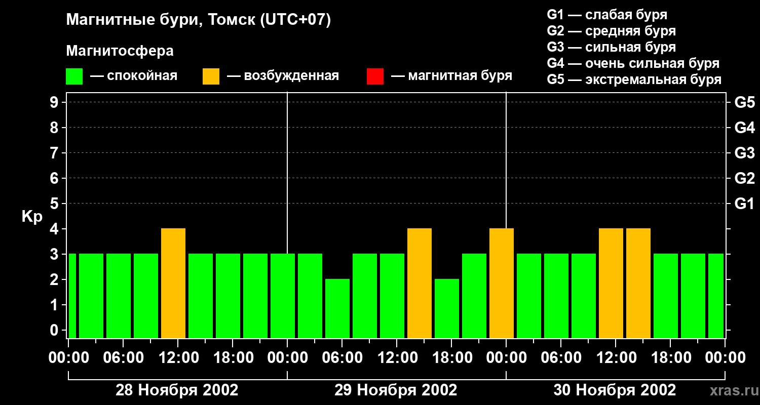 Изменения геомагнитного индекса Kp с 28 по 30 ноября 2002 года для средних широт