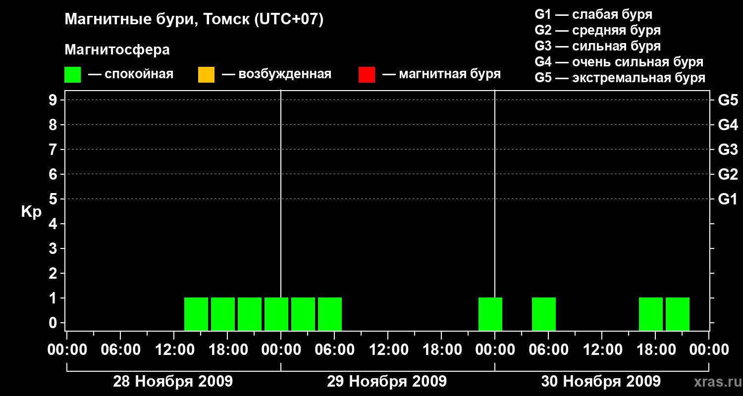 Изменения геомагнитного индекса Kp с 28 по 30 ноября 2009 года для средних широт