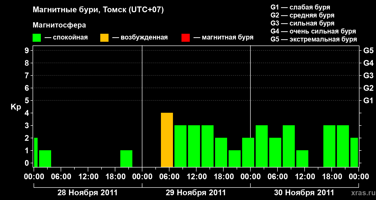 Изменения геомагнитного индекса Kp с 28 по 30 ноября 2011 года для средних широт