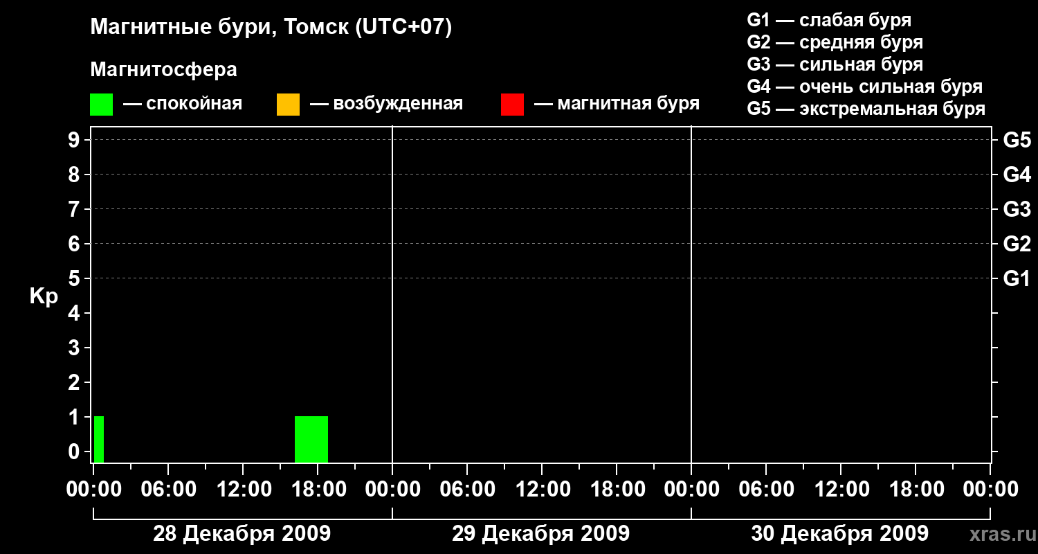 Изменения геомагнитного индекса Kp с 28 по 30 декабря 2009 года для средних широт